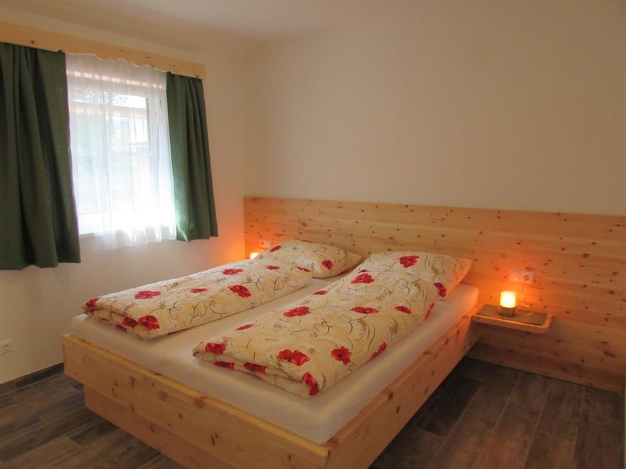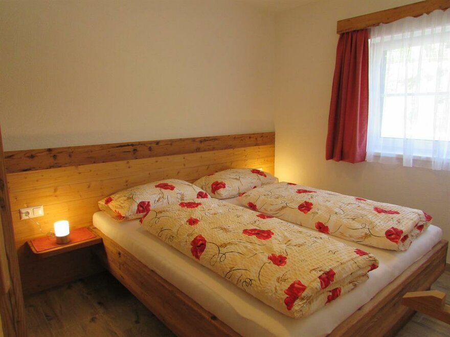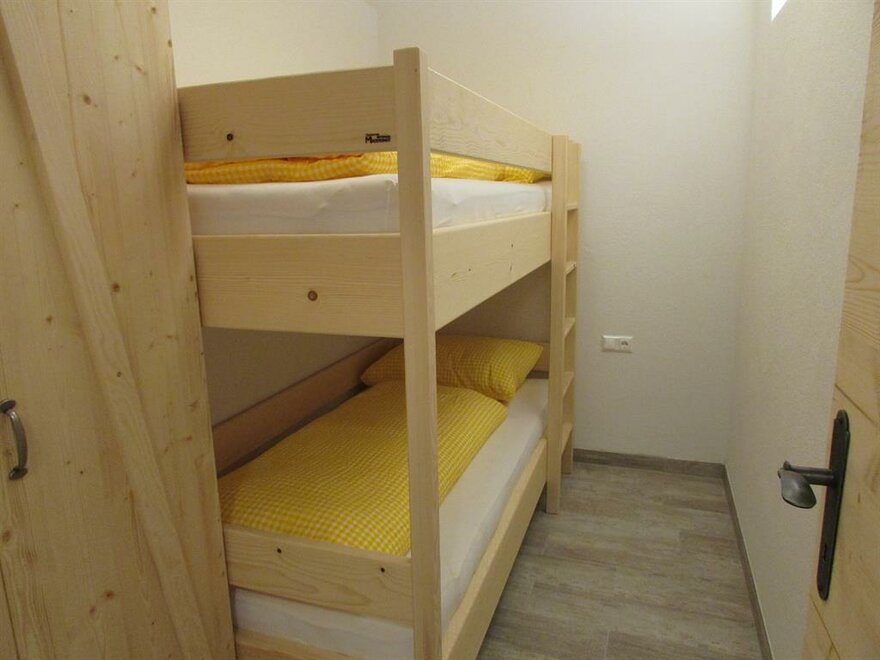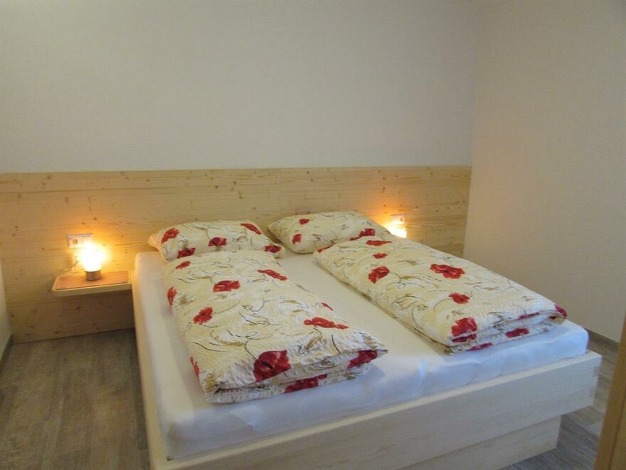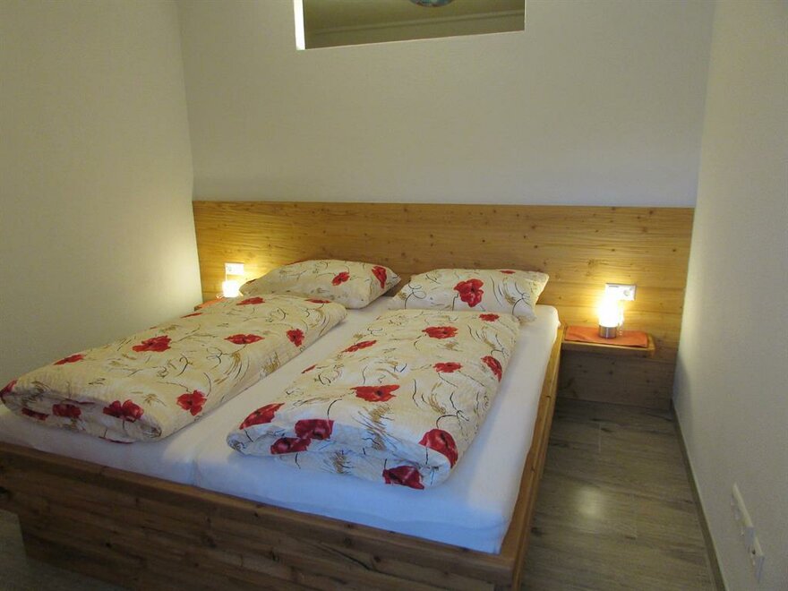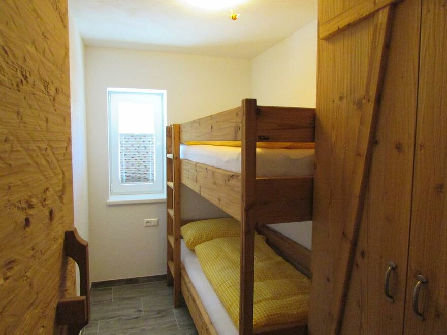 In the holiday apartment "Almhütte," there are three bedrooms (one with a bunk bed), a bathroom with a toilet, an extra toilet, and a living kitchen with a pull-out sofa for two people. This holiday apartment is very rustic in style.