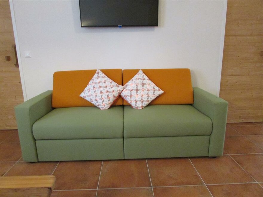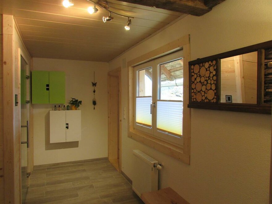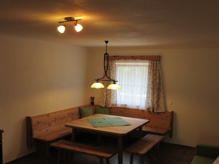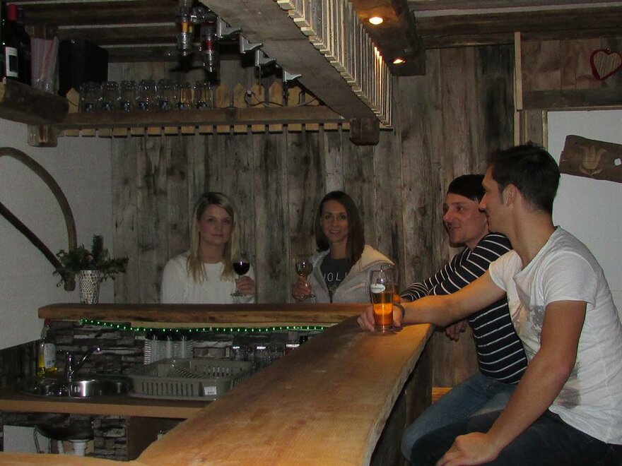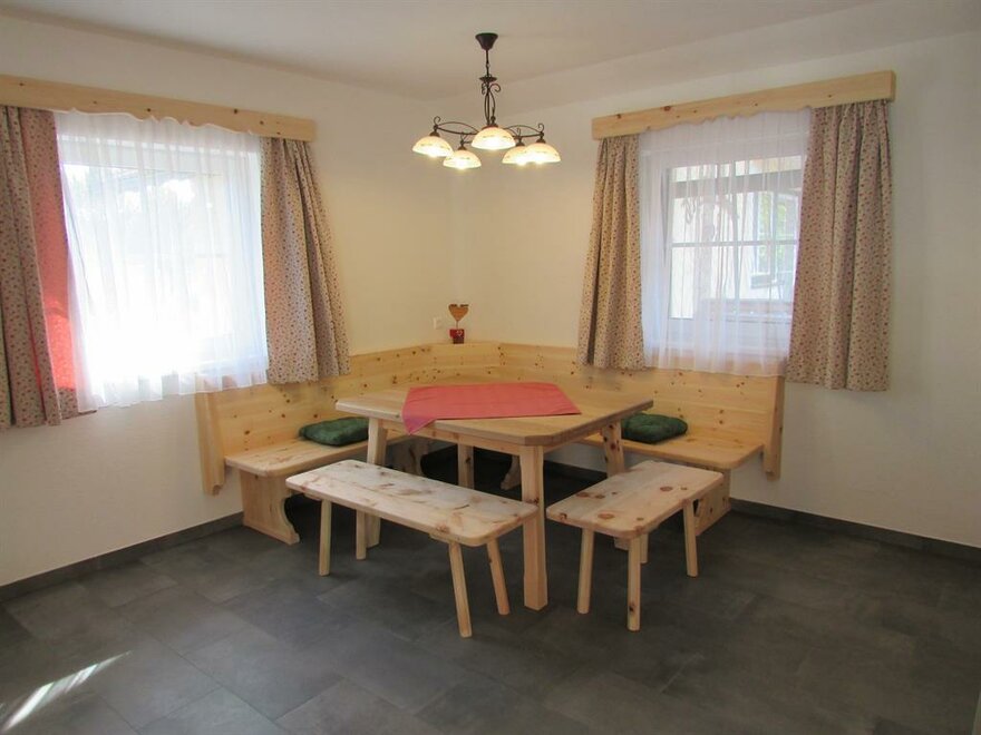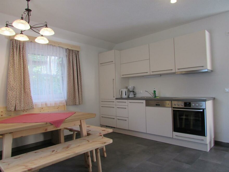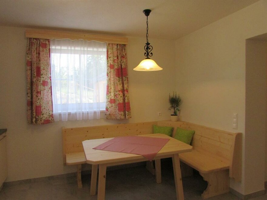 In the holiday apartment "Almhütte," there are three bedrooms (one with a bunk bed), a bathroom with a toilet, an extra toilet, and a living kitchen with a pull-out sofa for two people. This holiday apartment is very rustic in style.