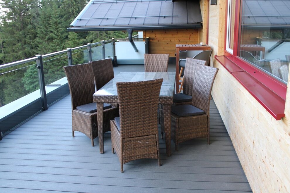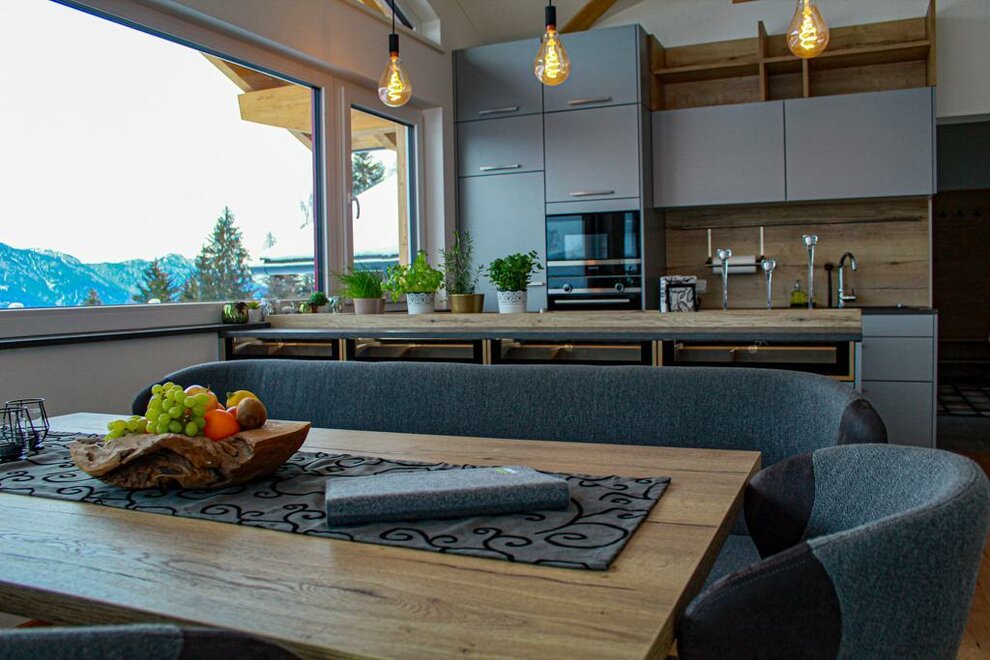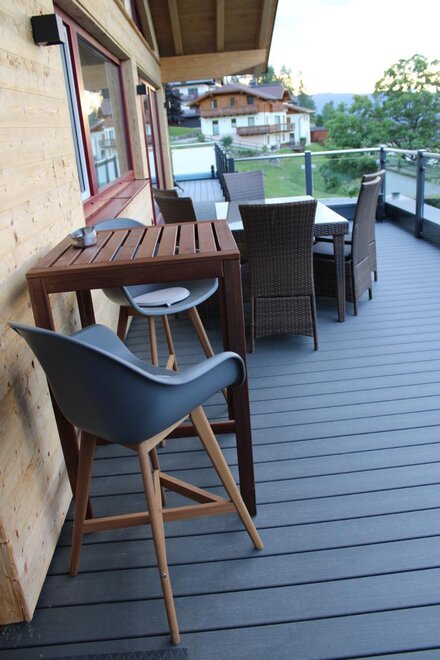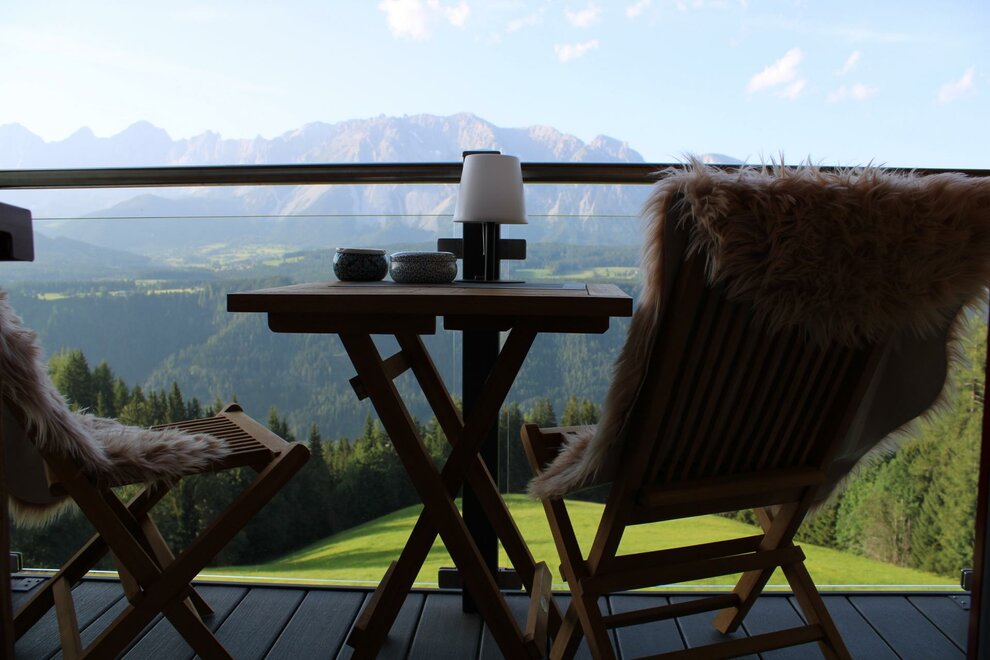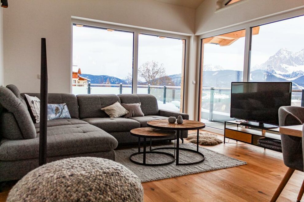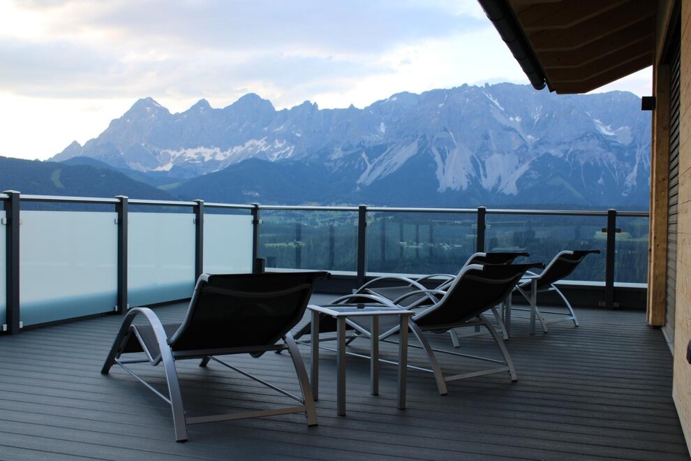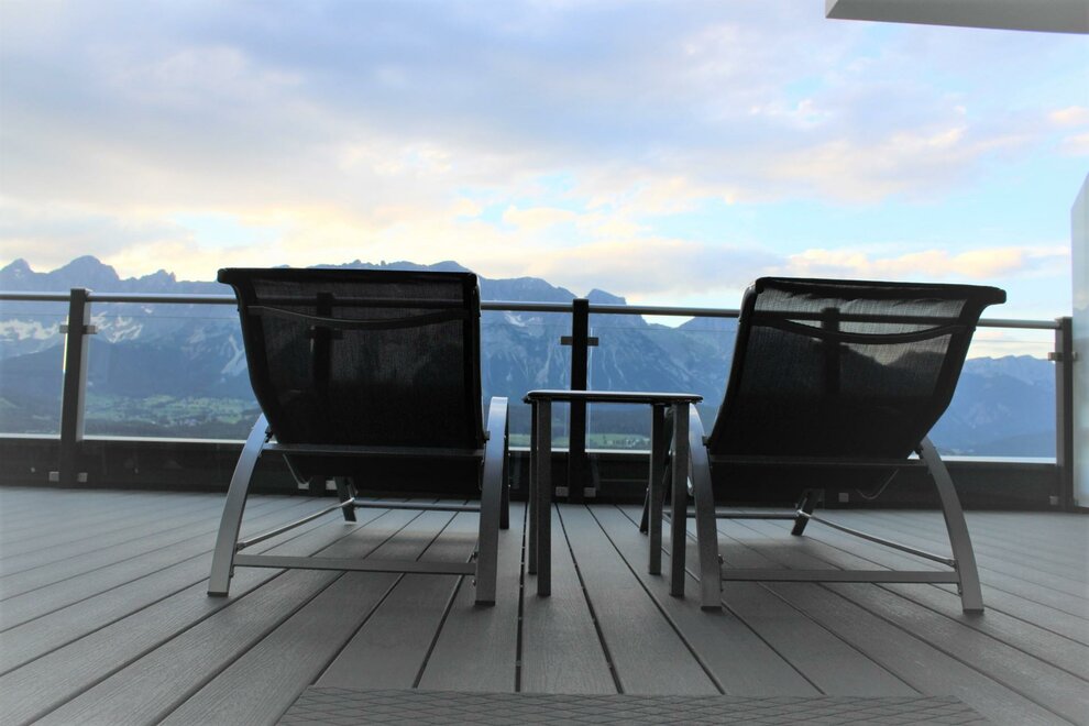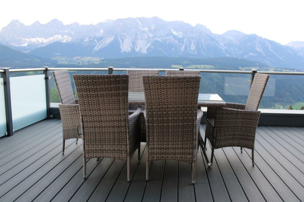 Newly built apartment for up to 8 people. Approximately 90 m2 with 2 bedrooms, kitchen with dining area and couch, 2 bathrooms with shower and toilet, 90 m2 terrace with a view towards the Dachstein.