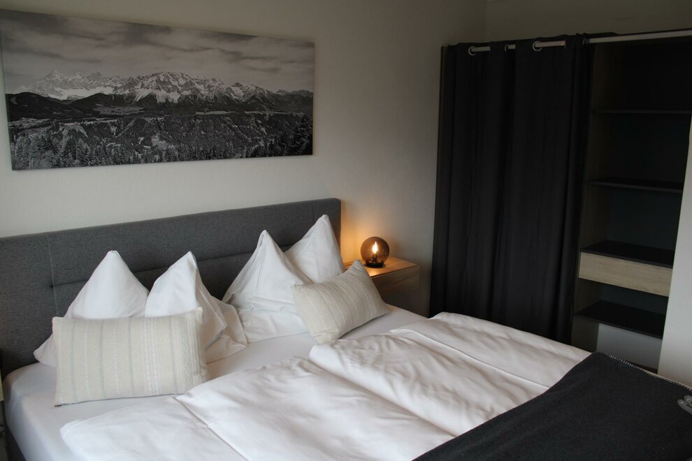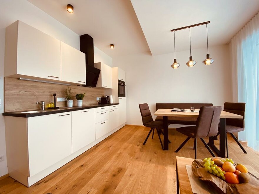 Newly built apartment for 5 people. Approximately 62 m2 with 2 bedrooms, kitchen with dining area and couch, 2 bathrooms with shower and toilet, balcony with a view towards the Dachstein.