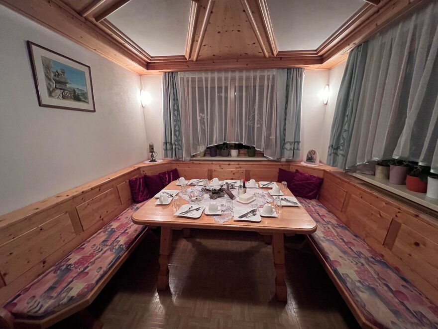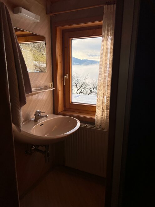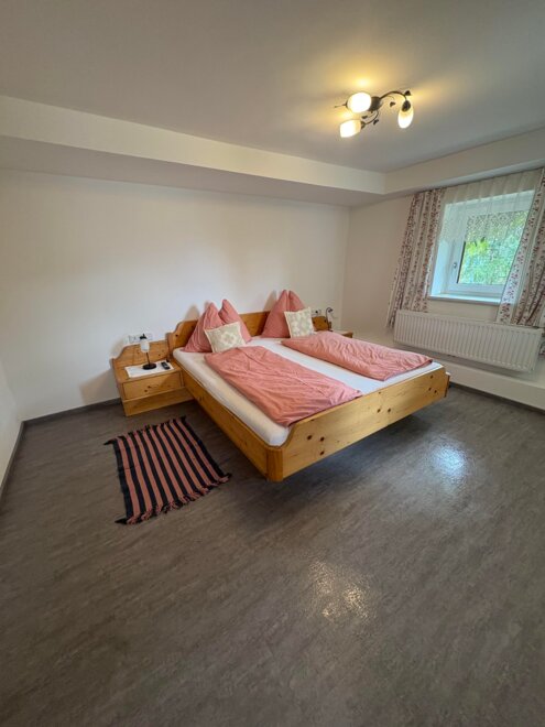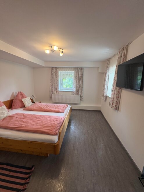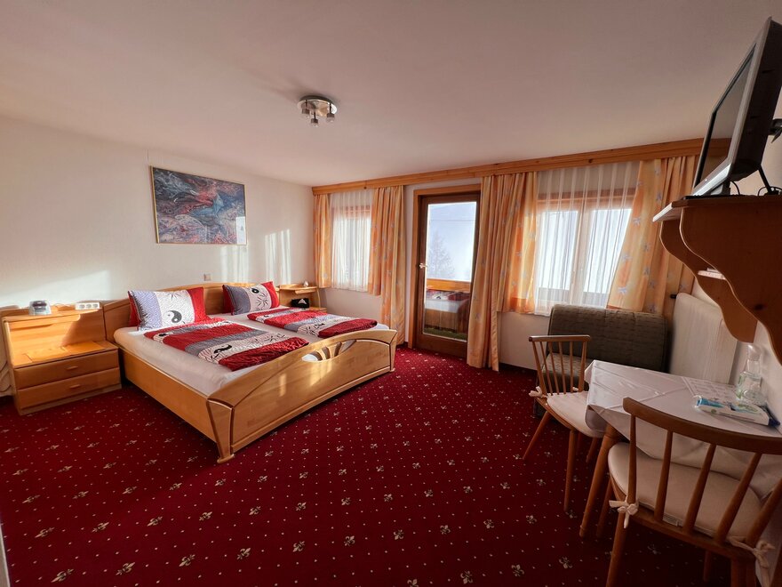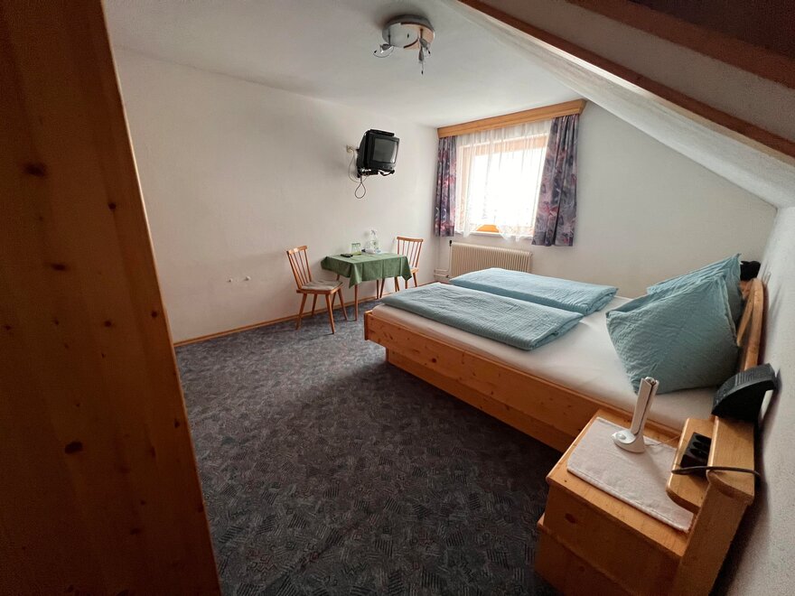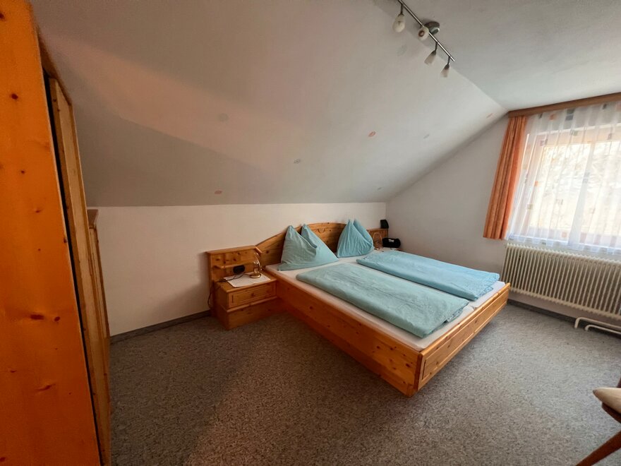 A double room in light birch with a large mirrored door wardrobe. Balcony facing south, 2nd floor with distant view from Pruggern to Hochwurzen.