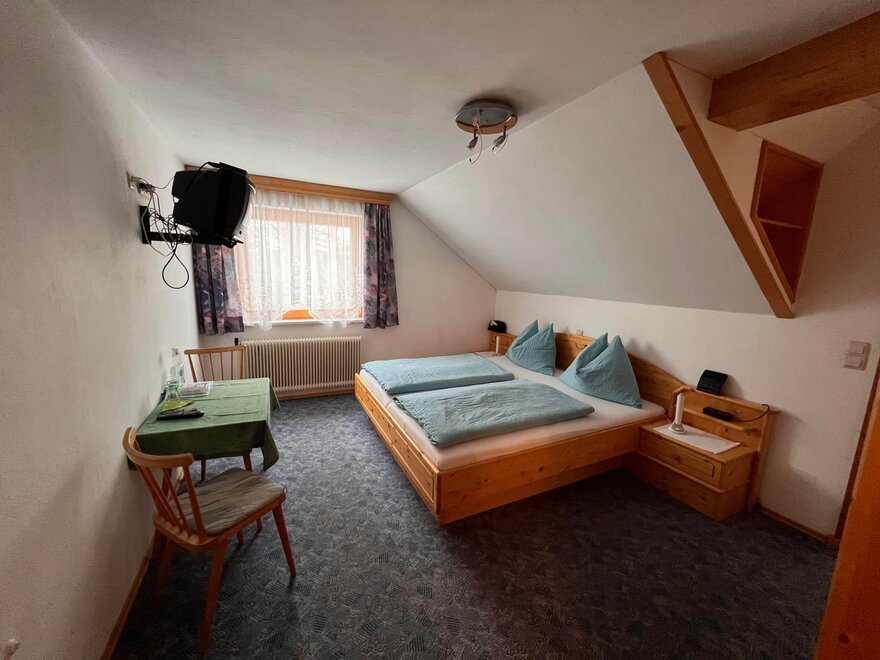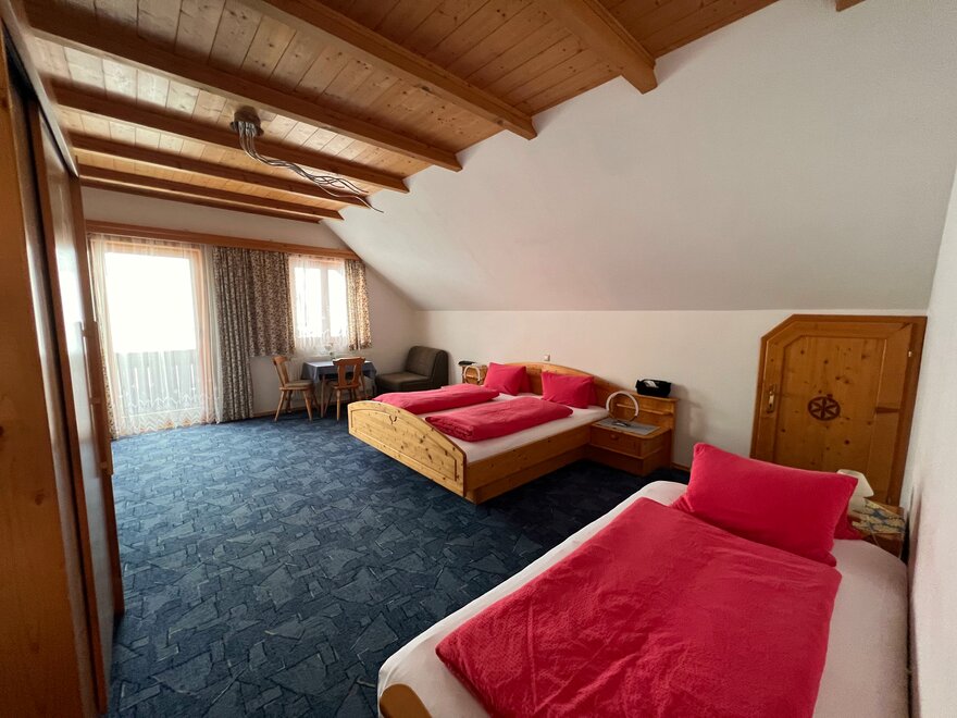 One double room on the 2nd floor facing the village, solid spruce furniture, rustic wooden ceiling and private balcony.