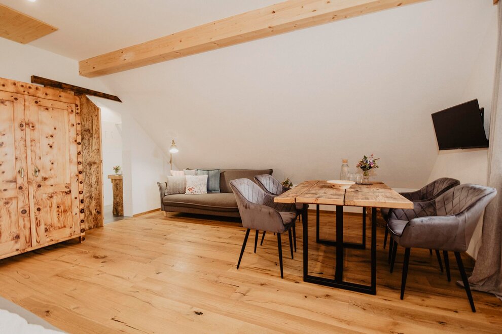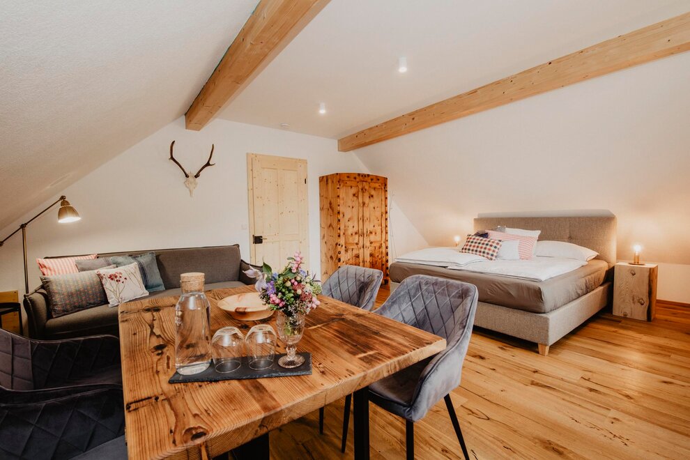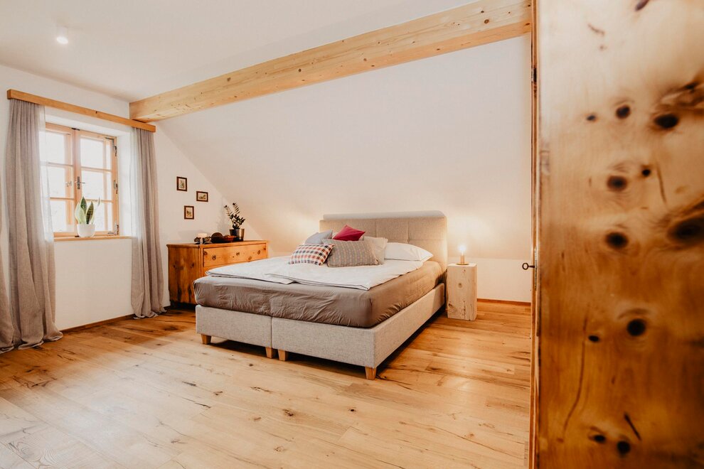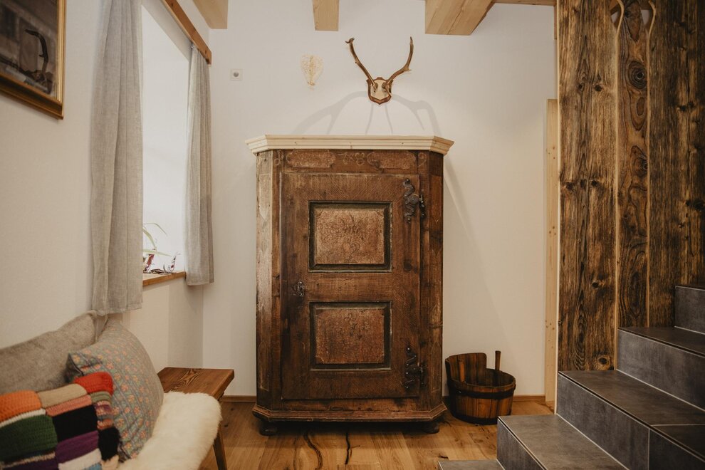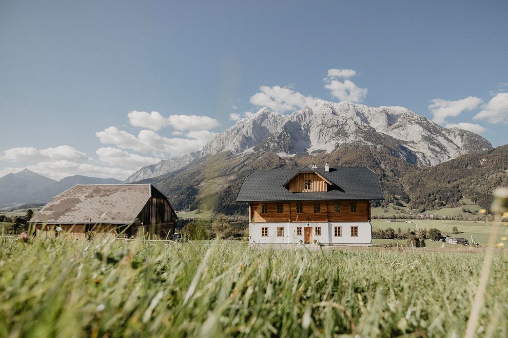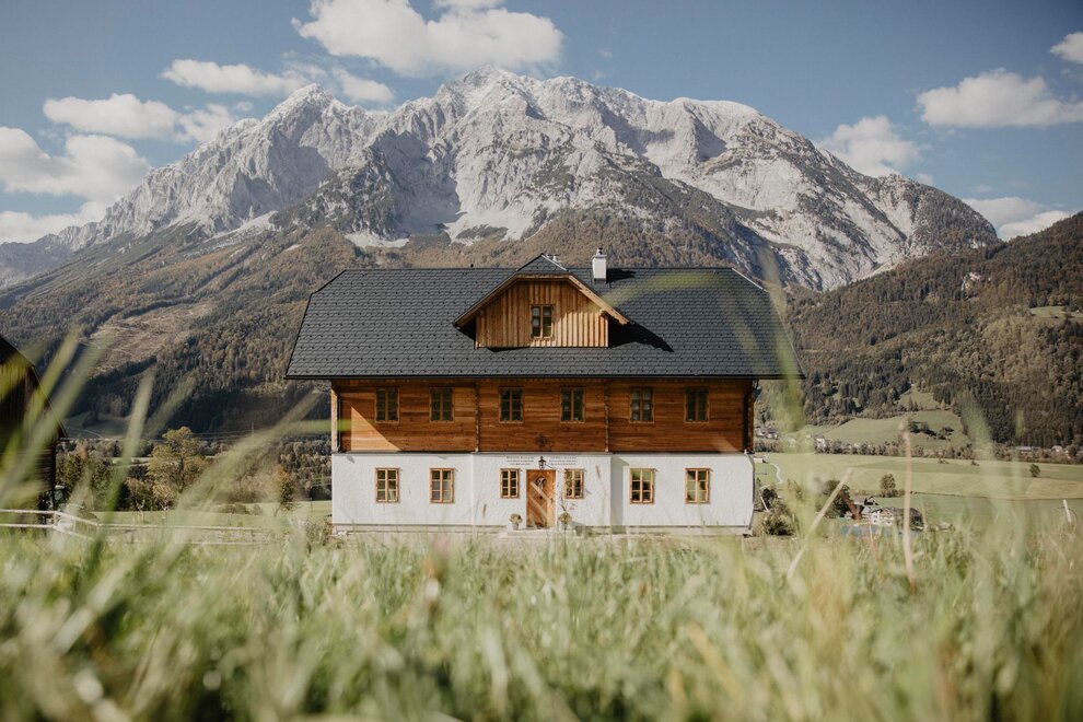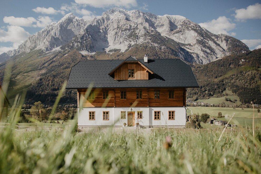 Nearly 100 years ago, our farm was awakened from its slumber. Tradition and modernity meet not only in the management of the farm, but also in the furnishing of our house. Countless hours of work have turned the farmhouse into a true jewel and a place to arrive and feel at home. Many objects already carry a wonderful story and invite you to write new holiday stories. Through the box windows you can see oxen grazing, wild animals at the edge of the forest and the rugged rock faces of the imposing Grimming massif, the highest free-standing mountain in Europe.