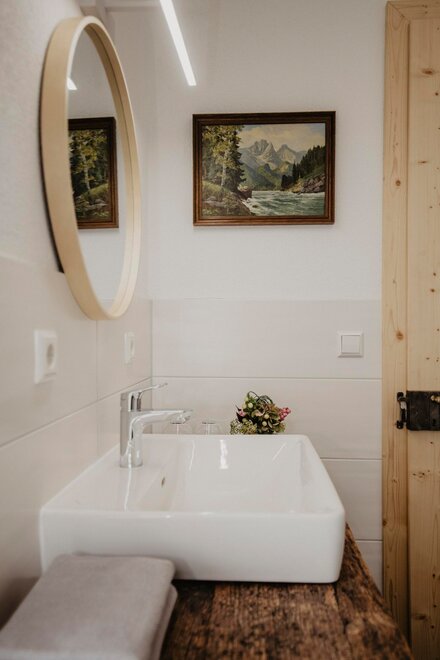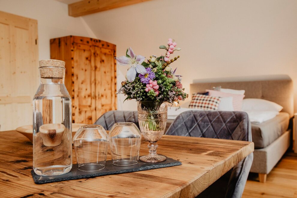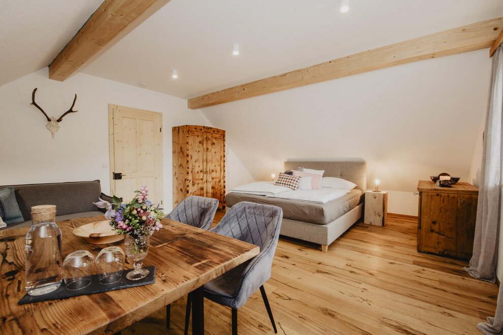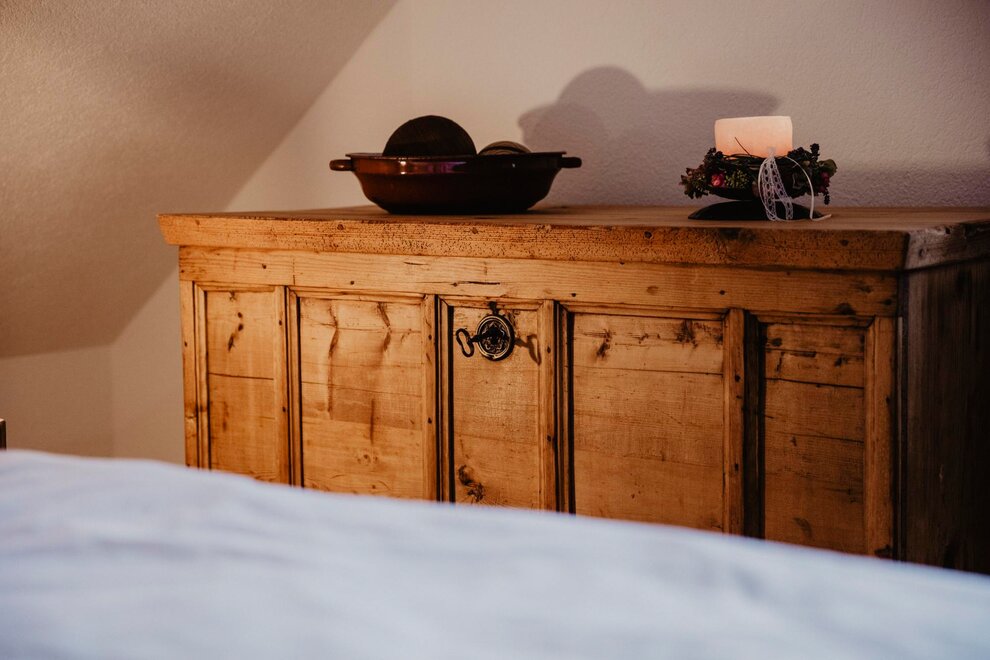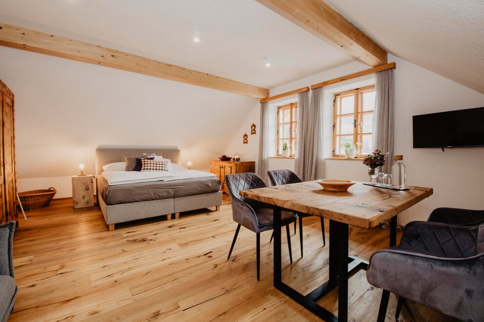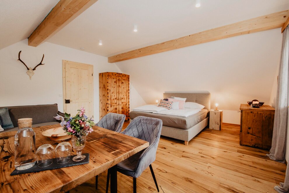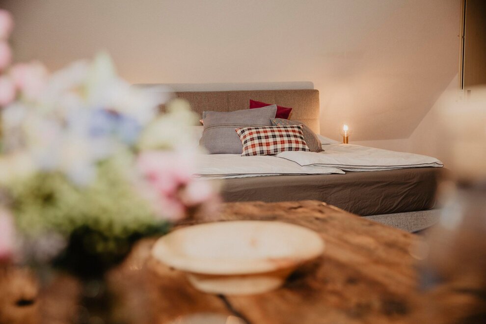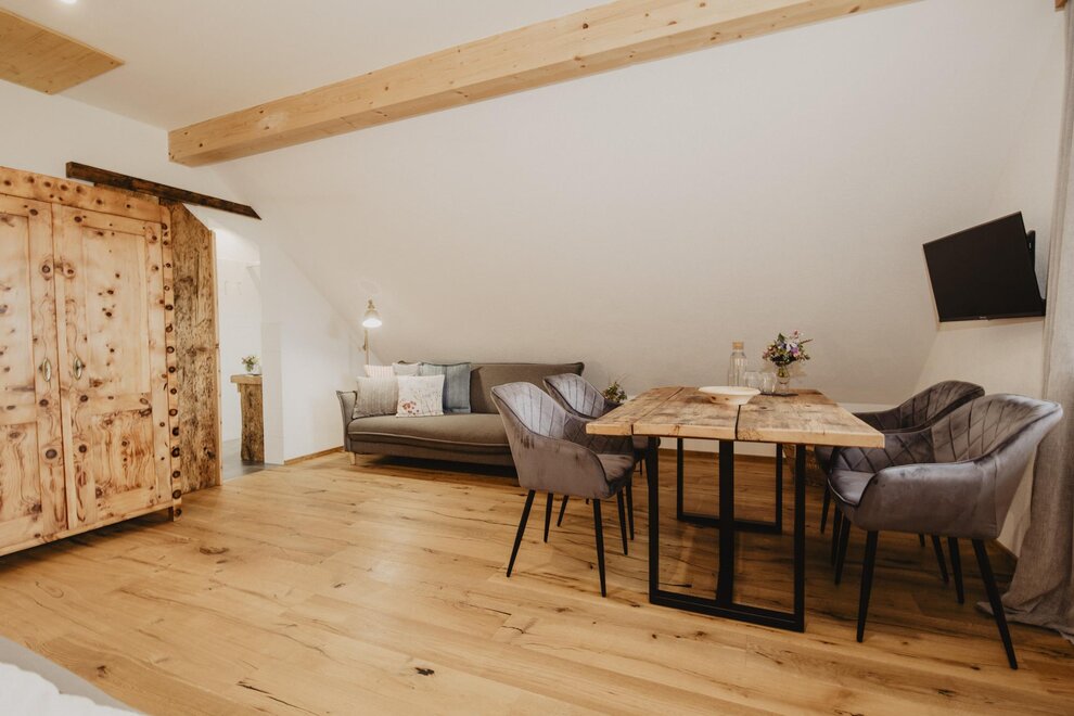 Nearly 100 years ago, our farm was awakened from its slumber. Tradition and modernity meet not only in the management of the farm, but also in the furnishing of our house. Countless hours of work have turned the farmhouse into a true jewel and a place to arrive and feel at home. Many objects already carry a wonderful story and invite you to write new holiday stories. Through the box windows you can see oxen grazing, wild animals at the edge of the forest and the rugged rock faces of the imposing Grimming massif, the highest free-standing mountain in Europe.