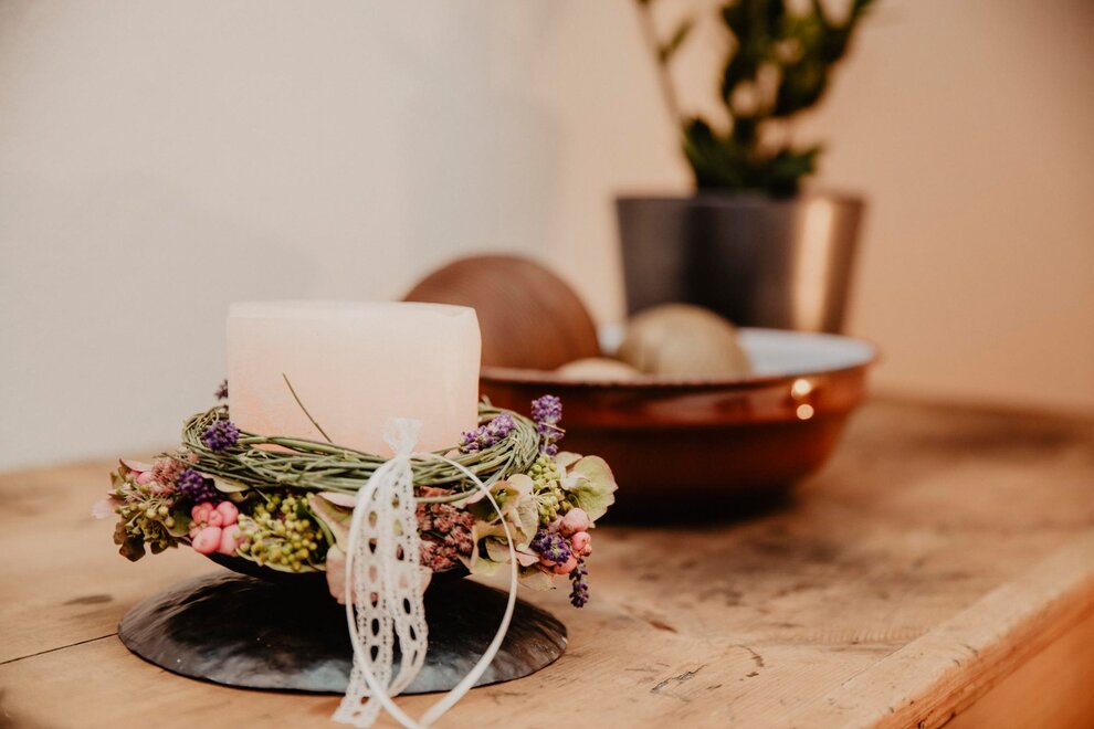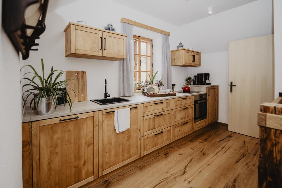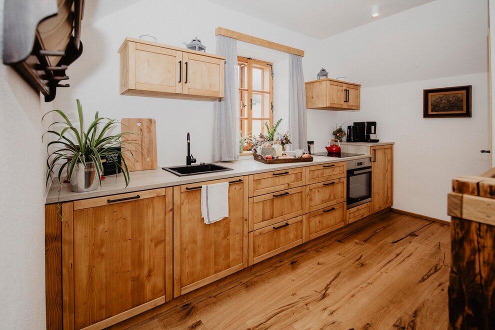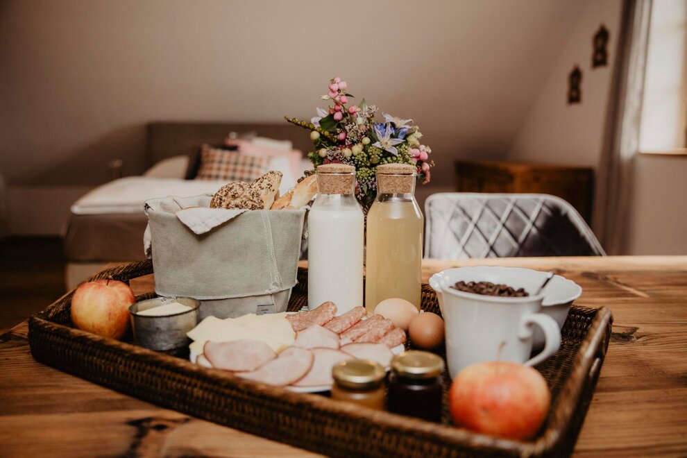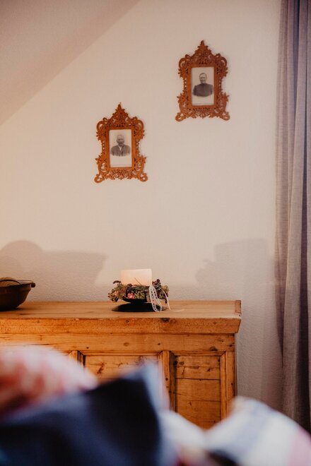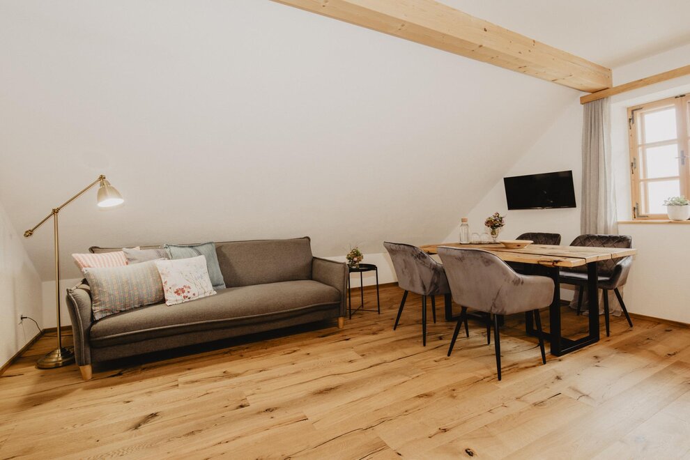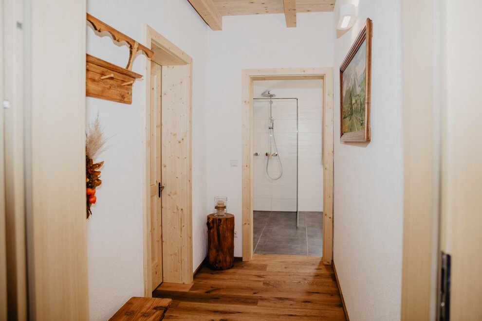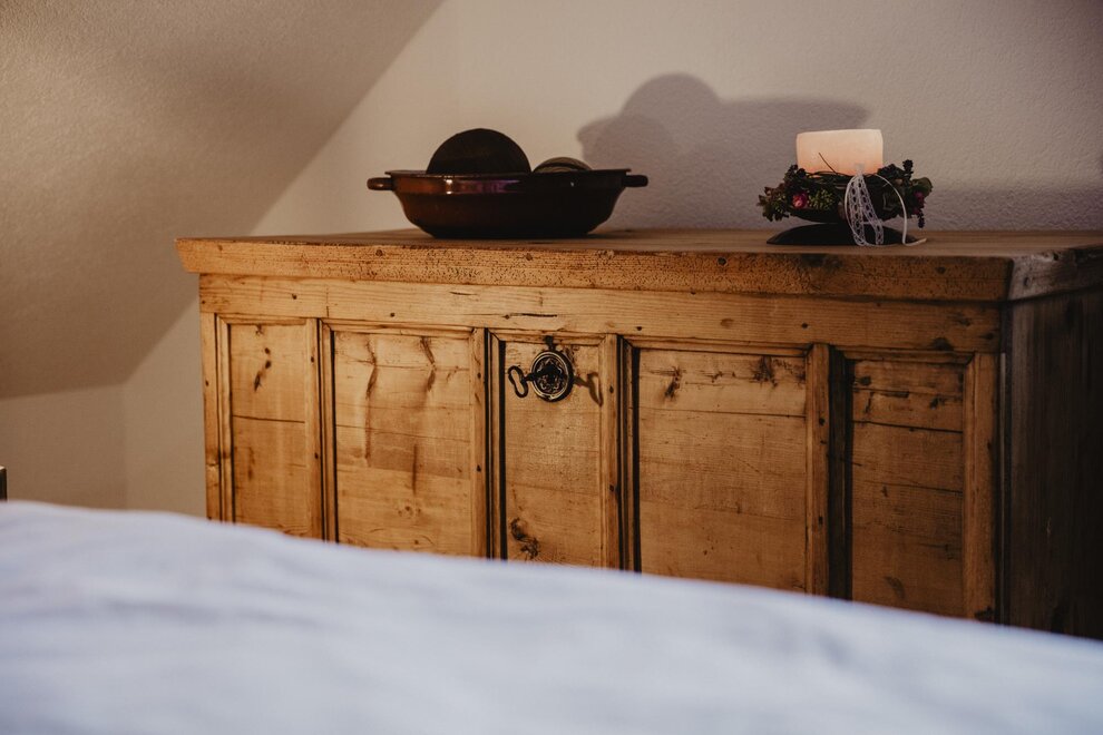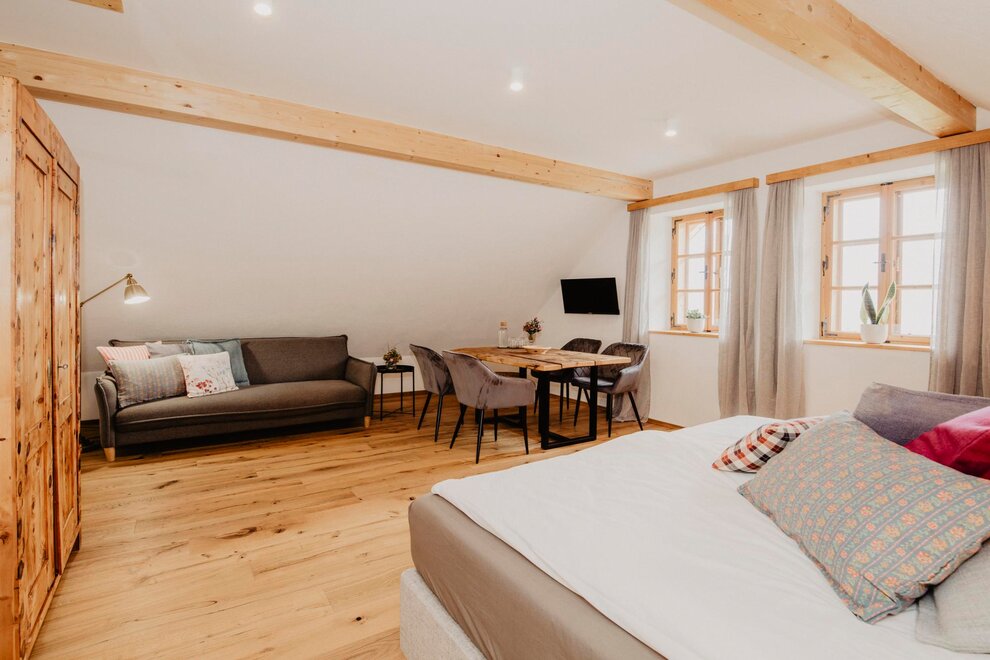 Nearly 100 years ago, our farm was awakened from its slumber. Tradition and modernity meet not only in the management of the farm, but also in the furnishing of our house. Countless hours of work have turned the farmhouse into a true jewel and a place to arrive and feel at home. Many objects already carry a wonderful story and invite you to write new holiday stories. Through the box windows you can see oxen grazing, wild animals at the edge of the forest and the rugged rock faces of the imposing Grimming massif, the highest free-standing mountain in Europe.