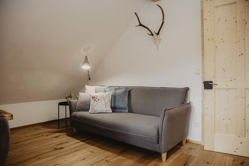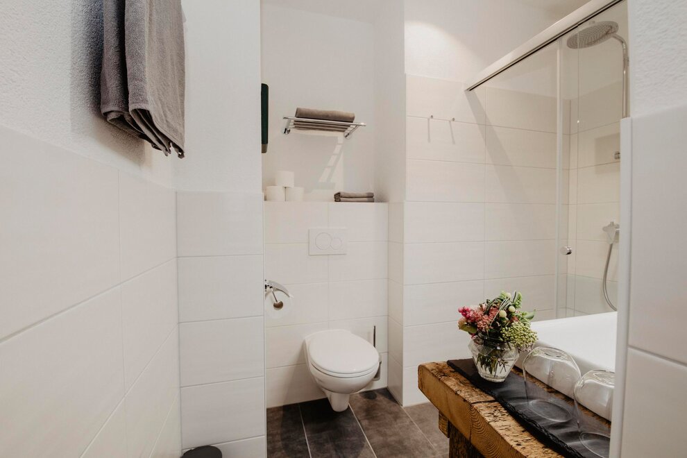 The holiday flat offers space for 2 people (additional 2 people on a pull-out sofa). It has a feel-good bathroom with washbasin, large shower and WC. In the fully equipped communal kitchen, all culinary wishes of our guests can be fulfilled independently, from breakfast to gourmet dinner. If you order in advance, we will be happy to fill your fridge and prepare an extensive breakfast basket for the perfect start to the day.