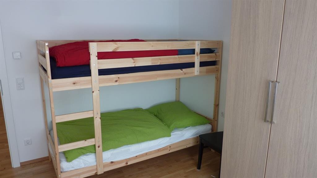 The ‘large family flat’ is located on the outskirts of Aich in the Schladming-Dachstein region in a sunny location in a newly built housing estate. In only 5 minutes by car, you can reach the first entrance of the 4-mountain ski area, the Hauser Kaibling. A cozy family flat for 2-6 people awaits you here, furnished to a high standard with 2 separate bedrooms (one with double bed and cot, one with double bed and bunk bed), 1 bathroom with shower/WC and a separate WC.