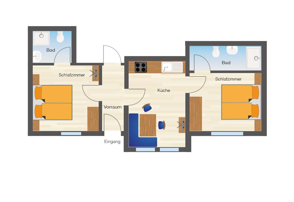 Apartment consisting of 1 kitchen, 2 bedrooms each with bathroom and toilet, TV and 1 anteroom with boot dryer. Free internet connection. Kitchen with TV, electric stove, dishwasher, refrigerator, microwave, kettle and coffee machine. For a surcharge, we offer bread roll service.