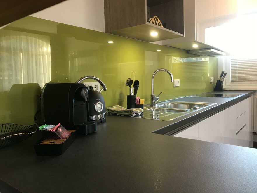 freezer compartment, cable TV, kitchen and table linen, quiet room/apartment, refrigerators available, island kitchen, electric stove, balcony furniture, bedding, safe, WiFi, toiletries, towels available, carpeted bedroom, heater, combined bedroom/living room, bed linen available, vent hood, hairdryer, furniture suite, no pets allowed, dishwasher, modern furnishing, microwave, good as new room/apt., combination microwave, dishes available, family room/apt., balcony, internet connection available, non-smoking room/apt., separate bedroom/s: 1, anteroom, TV, oven, garden, dish sink, refrigerator, kettle, coffeemaker, open plan kitchen/living room