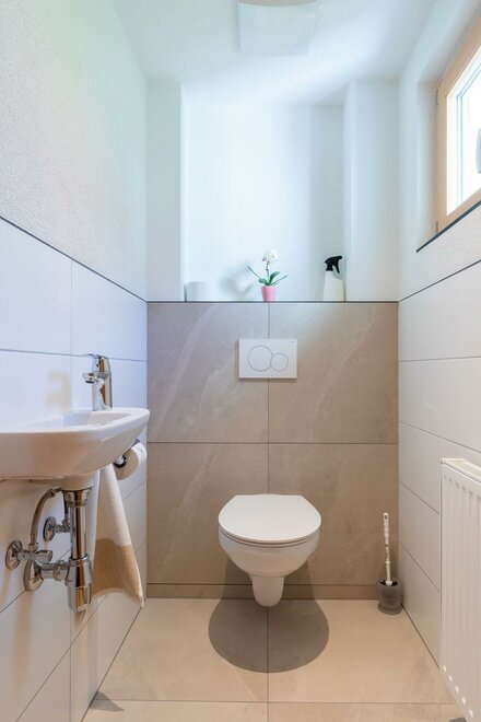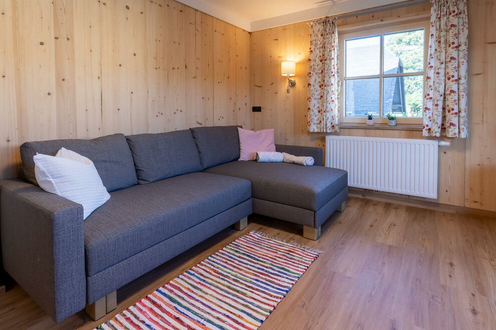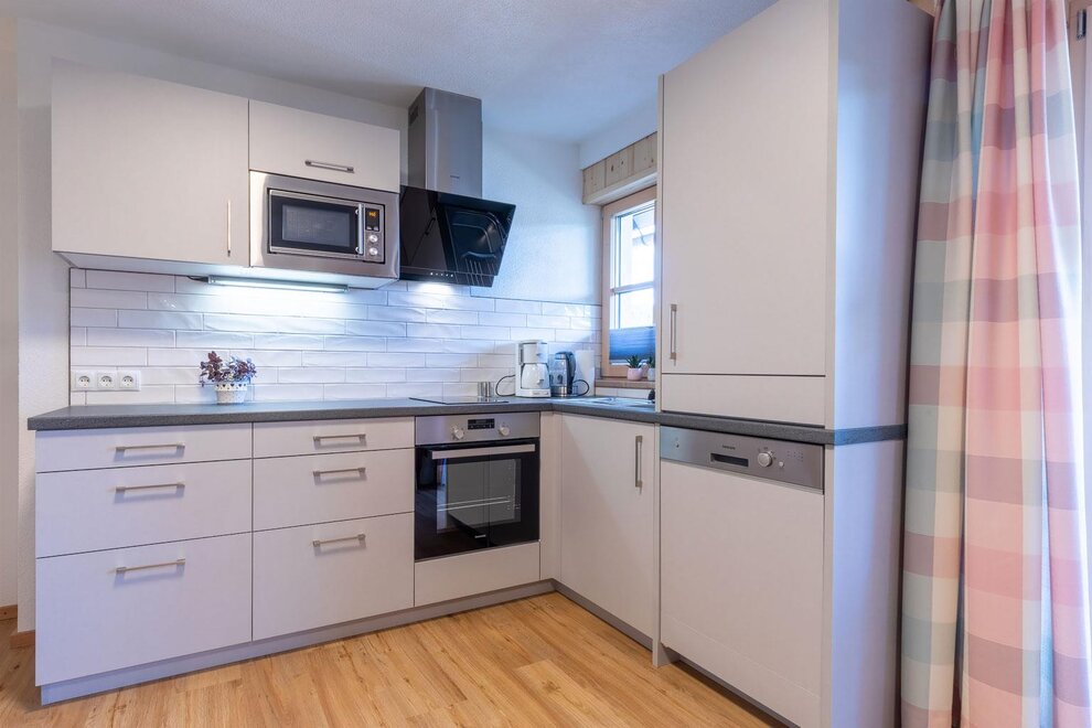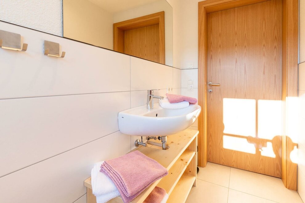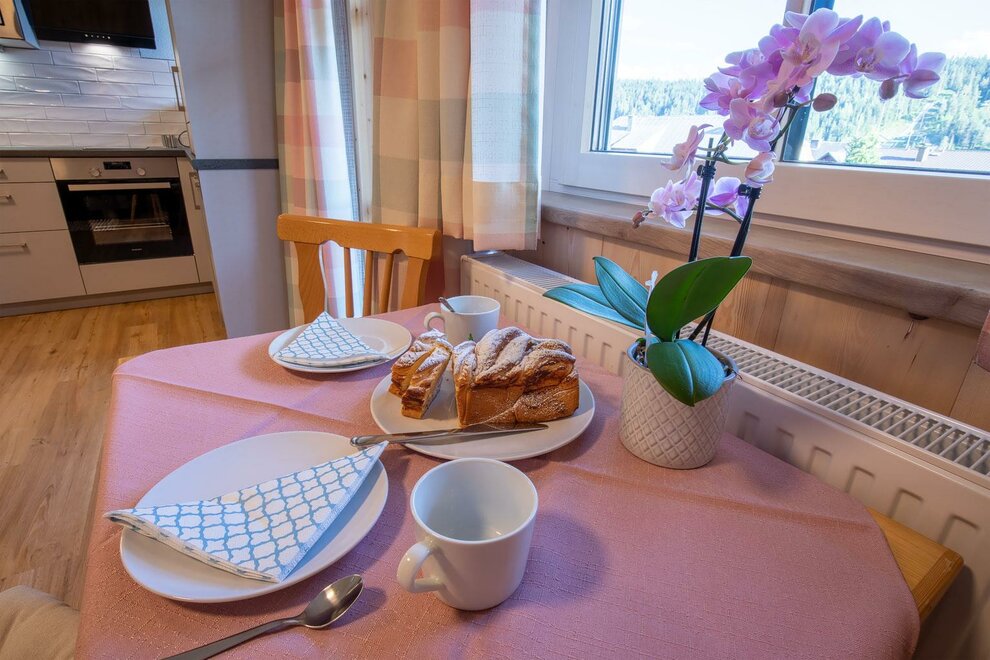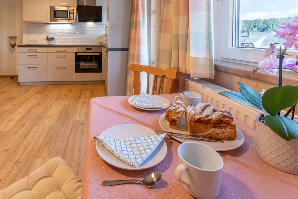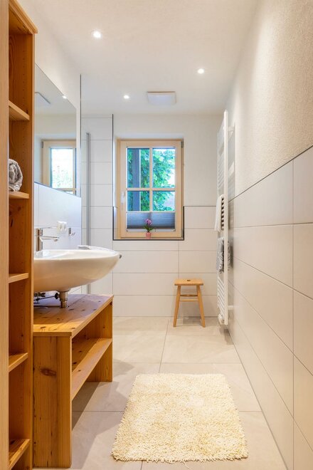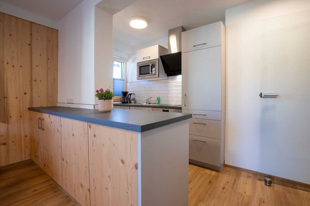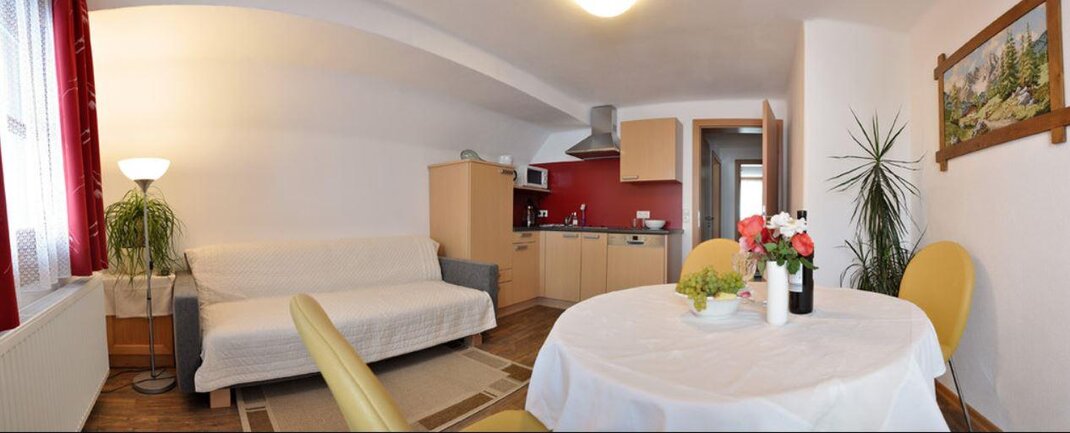 Our Apartment II "Enzian" is located on the 1st floor and is oriented towards the south/west. After its renovation in 2021, the apartment has become a sunny, cozy oasis for relaxation. Lots of wood and a lovingly designed interior invite you to unwind and enjoy. A double bedroom with wooden floors and wooden furniture, a spacious bathroom with shower, separate WC, and a roomy entrance area complete the "highlight" - the living kitchen facing south with balcony. The living kitchen features a well-equipped kitchen, dining table, and a cozy sofa with a TV corner. The bright, friendly room invites you to enjoy in any weather – even on the balcony in sunshine.