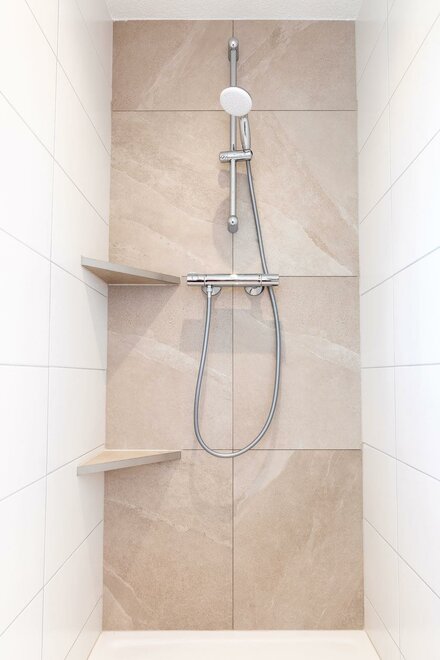 The apartment consists of a bedroom, a small kitchen with living area and balkony facing east, a very roomy bathroom (our highlight !), separat toilet and a lobby with wardrobe.