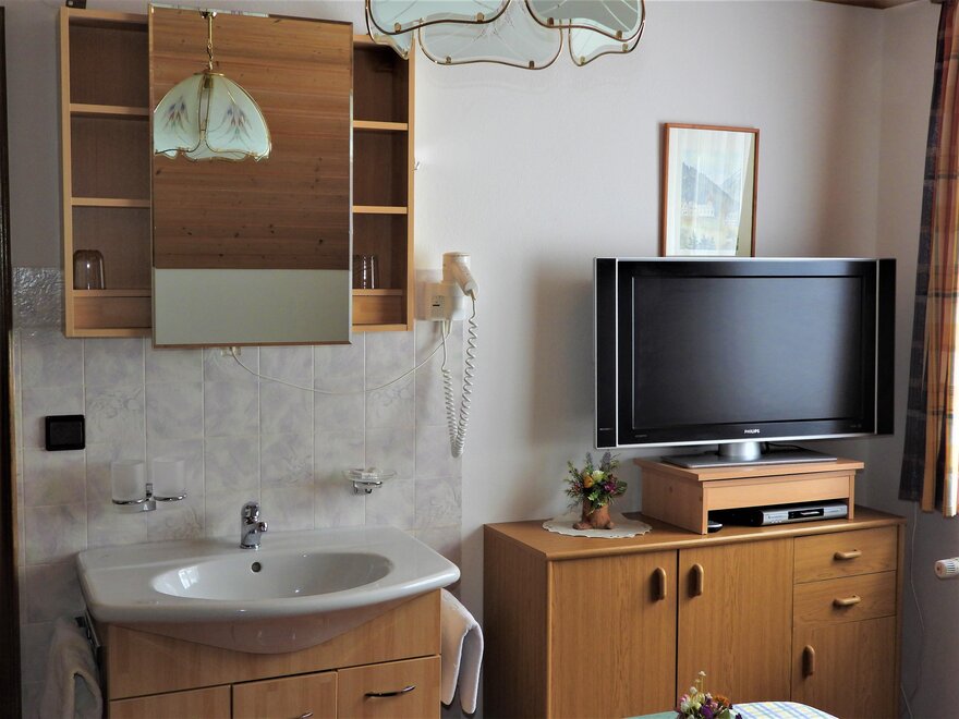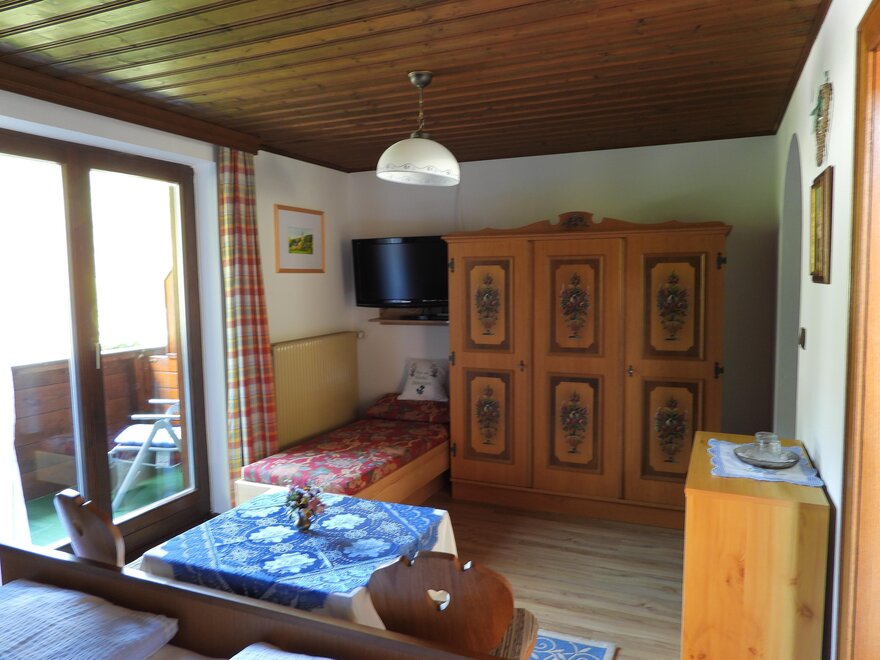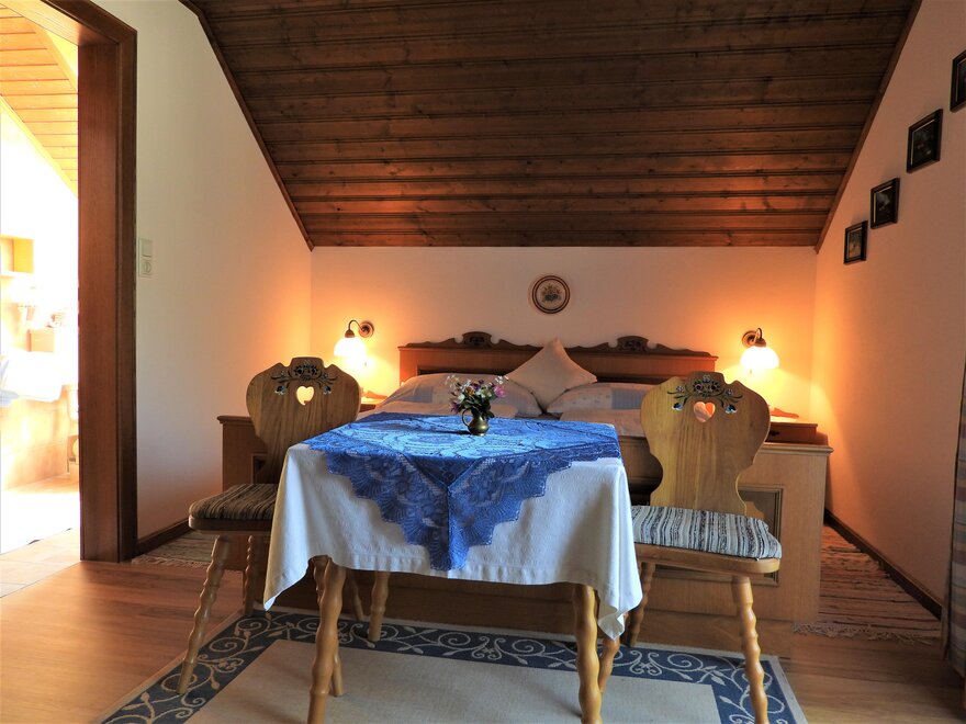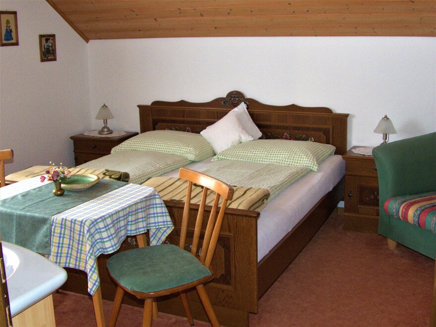 Our rustically furnished double room with shower, WC, extra bed, balcony, TV and free WiFi is a place to feel at home. Here you can enjoy the peace and quiet and the view. You can also reach us at the following cell phone number: 06644512114