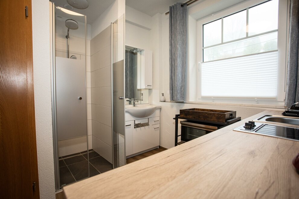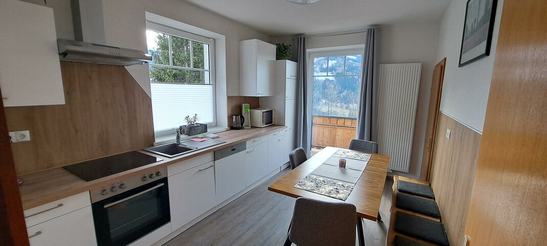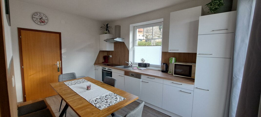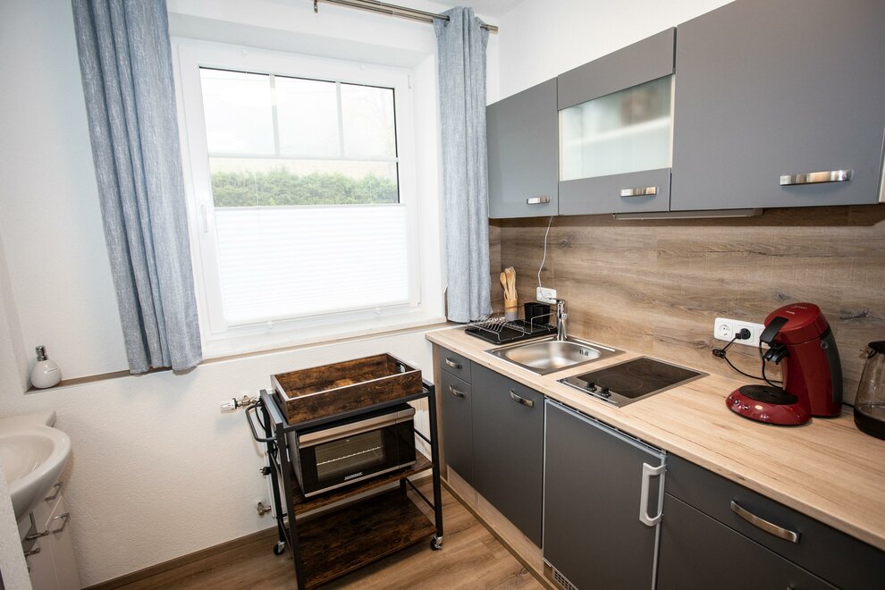 1 kitchen with fridge, microwave, Senseo coffee pod machine and stove