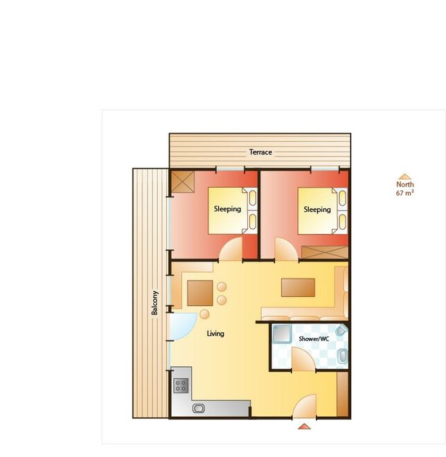 Size 60 m² Occupancy 2 - 4 adults Rooms 2 Bedrooms 1 Room details