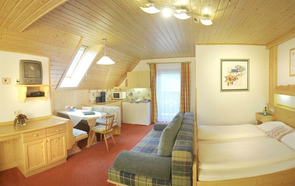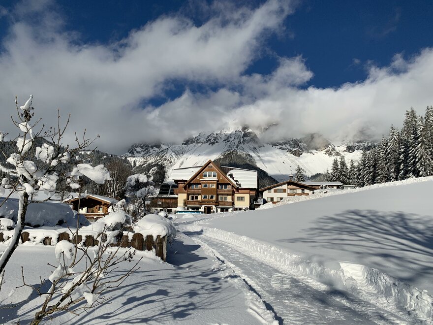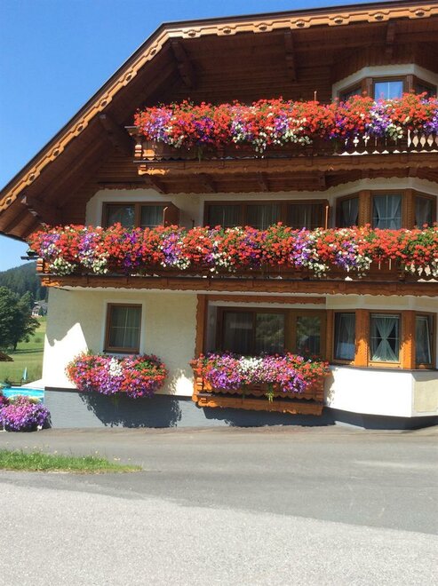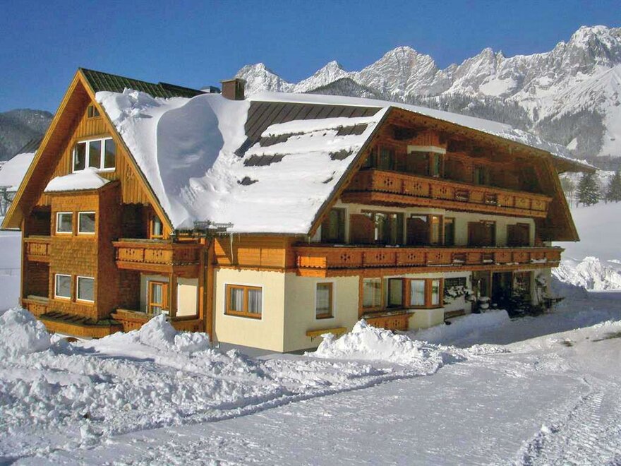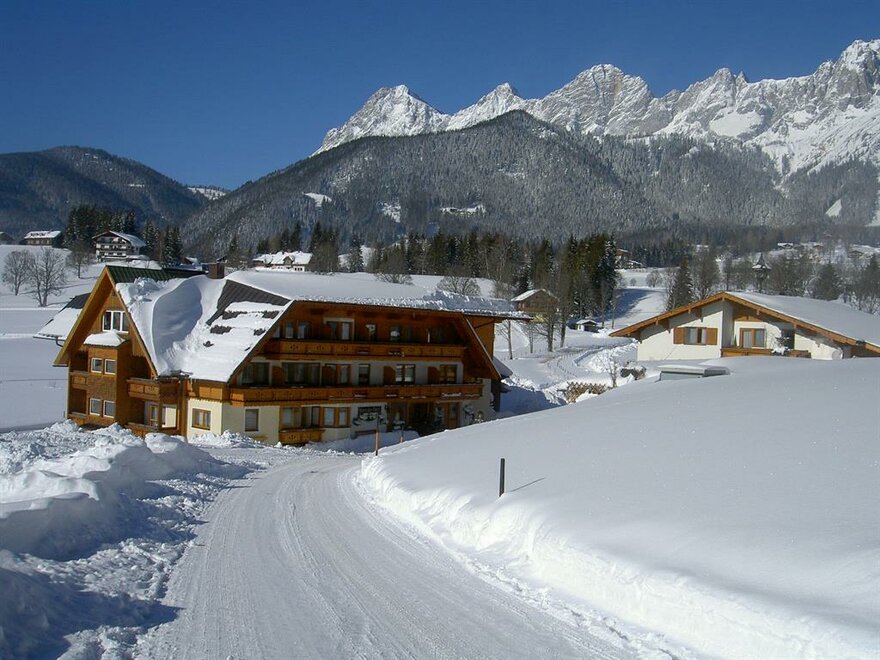 Welcome to our family run 3*** Hotel Pension Haus am Bach, in a sunny and quiet location in the holiday paradise Ramsau am Dachstein. Families and sports enthusiasts of all age groups can relax in our Hotel Pension in Austria Ramsau am Dachstein is one of Austria’s most beautiful holiday regions, in summer as well as in winter. Right beside our house you can access the winter walking paths, the cross-country tracks and skating trails. Cross-country skiers find 220 kilometres of trails for Nordic skiing, leaving nothing to be desired. The Rittisberg with its children’s winter world “Erlebniswinterwelt” is only 5 minutes away by car. The ski resorts of the Ski amadé area, including the Schladming-Dachstein interlinked 4 mountains Planai, Hauser Kaibling, Hochwurzen and Reiteralm can be reached within 20 minutes by car. The free of charge ski bus stops close to our hotel. In summer we are an ideal starting point for hikes, mountain bike and via ferrata tours, horseback riding, or strolls for those who prefer easy-going walks such as families with pushchair. Our Hotel Pension Haus am Bach offers bright, cosy, and comfortable double rooms (on request with balcony), as well as spacious holiday apartments for 2 to 5 persons. The hotel rooms have a private bathroom with shower and WC, as well as TV, and a balcony. The holiday apartments also have private bathrooms with shower/WC, a TV set, a fully furnished and equipped sit-in kitchen, and separate bedrooms. WLAN is available in the whole house. For groups, we offer a bright meeting room for up to 50 persons, equipped with overhead projector, beamer, big screen, flip chart, video recorder, and stereo. For your children, we have a large playground and space to play in the garden. In summer, our little guests can play to their heart’s content and choose between slide and swings, table tennis, and many more toys. Our rabbits and cats are happy to have little caretakers. In case of rainy weather and in winter, the playroom invites to play and have fun. Furthermore, there is a biotope to enjoy and to admire, as well as an aviary with 20 different kinds and all together more than 100 birds. In summer you relax after an active day out in our well-being area with sauna, steam bath, infrared cabin, hot tub, and solarium. Our guests are offered a large breakfast buffet with regional produce. In the evening, we spoil you with a 3 to 4-course set dinner. We prepare delicious home-style and traditional dishes, as well as a large selection of salads. Enjoy light-hearted holidays in our 3*** Hotel Pension Haus am Bach in Ramsau am Dachstein! Your hosts, the Tritscher Family