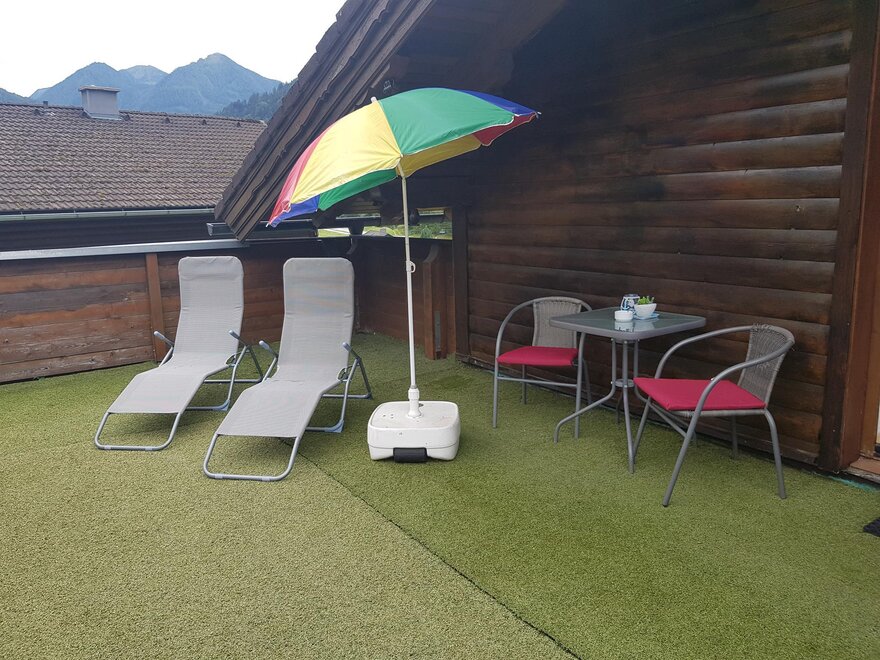 Spacious room with wooden furniture, floor heating, seating area, flat-screen satellite TV, bathroom and balcony with panoramic views of the Panomram. The bathroom has a hairdryer. A teakitchen at same elevation ist ready for your use.