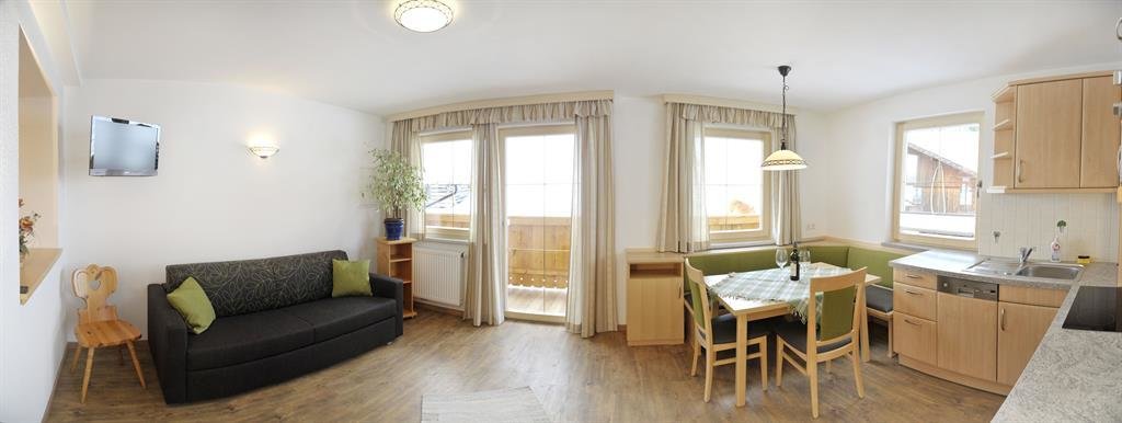 We have equipped our apartments with natural materials like wood and wool. It was our aim, to create a nice and well-being area for you. Moreover you can enjoy the marvellous view in the mountains. All our apartments have a balcony and a television. There are different types, with different sizes and equipements.