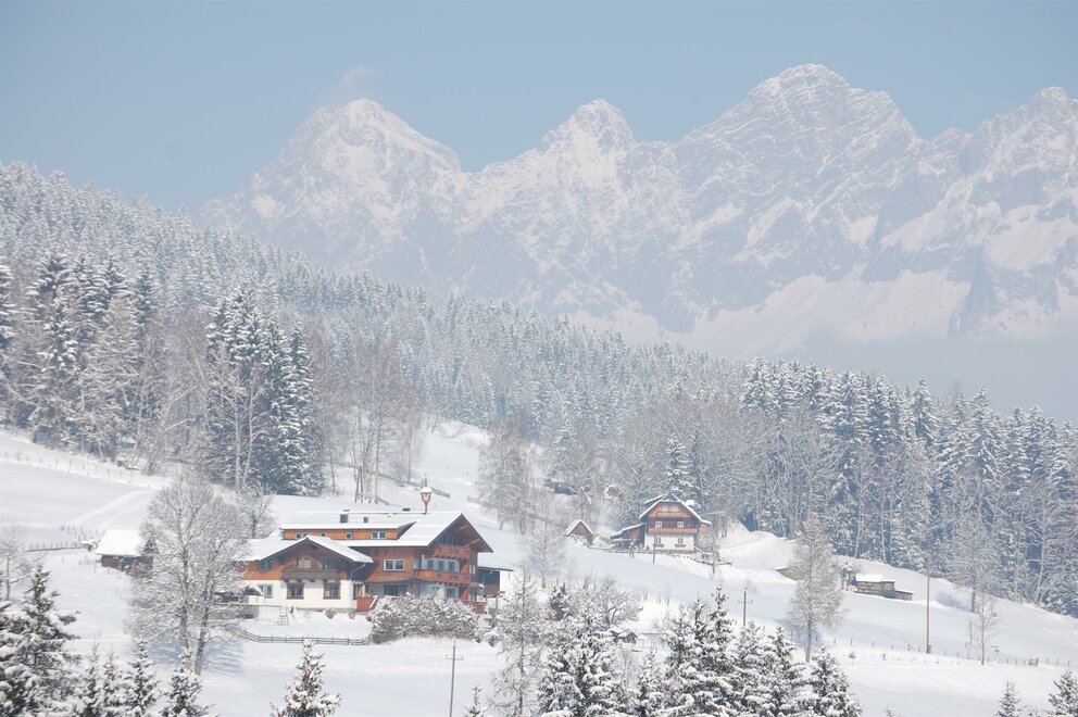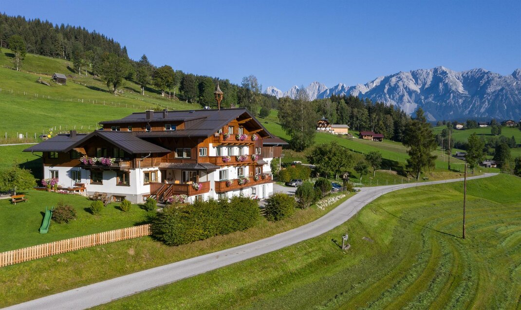 Apartment Dachstein (35m2) and App. Nostalgie (35m2) They consist of one big bed and living room with a second bed room for your children with a bunk bed. From your bed you have a marvellous view on the Dachstein. Up to 4-5 people can stay in this apartment. It has a small kitchen with a dining table and a bathroom. The kitchen is equipped with a fridge and a small freezer, an electric cooker, a coffee machine and a kettle. Cutlery, dishes and pots for cooking are available. Of course we supply towels and bed linen.
