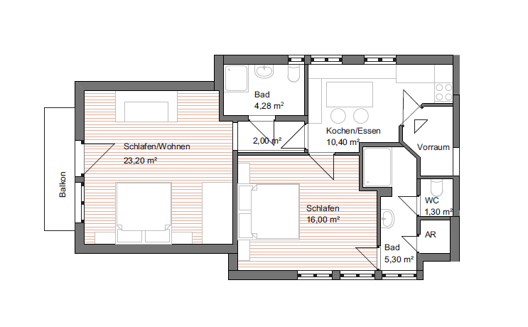 Our pine apartment is ideal for two couples who want to retreat but still desire a shared kitchen. The pine is known to calm the nerves and contribute to better sleep - the foundation for a relaxing vacation.