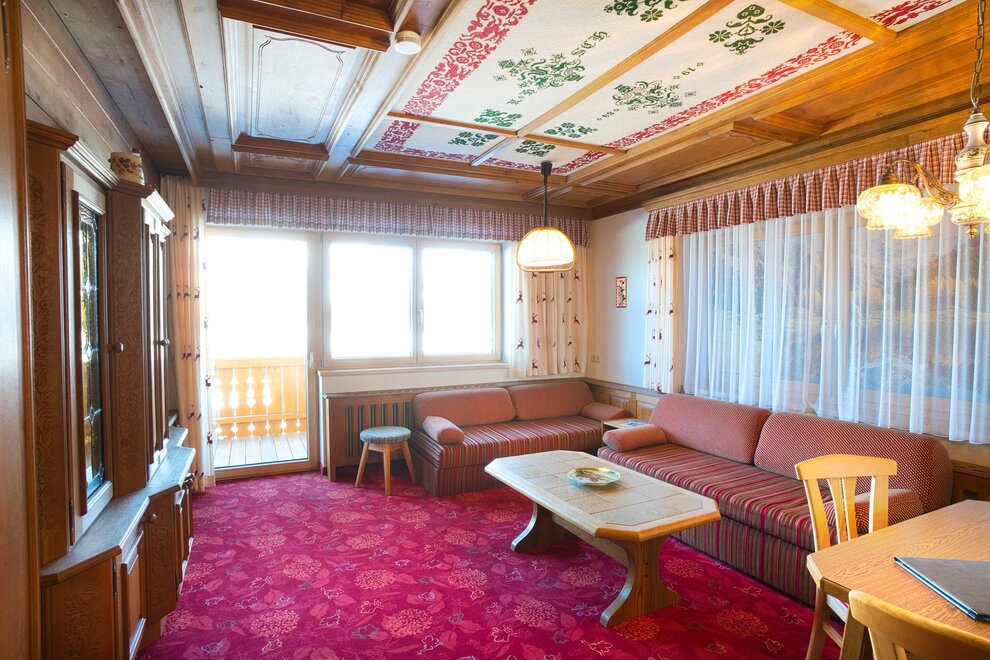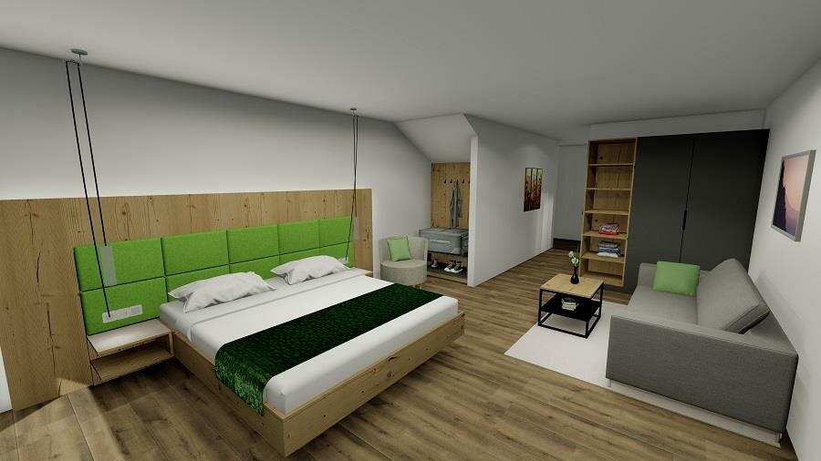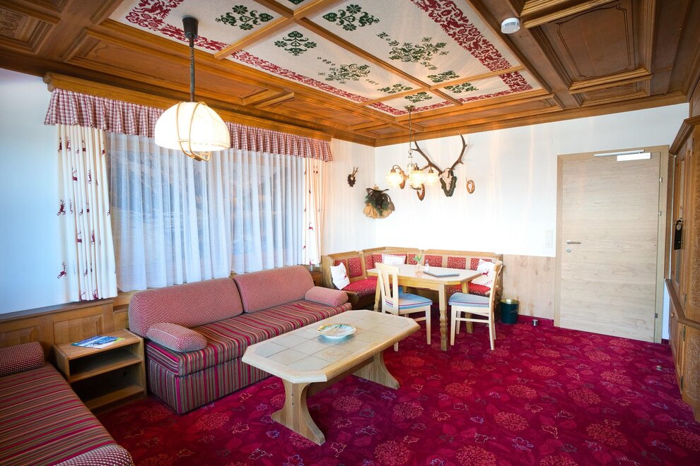 Rustically furnished family room with solid wood furniture, 2 sleeping areas, one with seating area, mini kitchenette in the entrance area, shower/WC separate.Room/apartment features