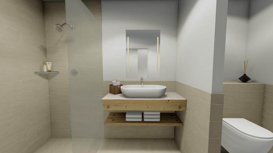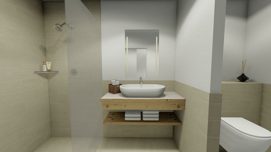 shower, double sink, separate toilet
