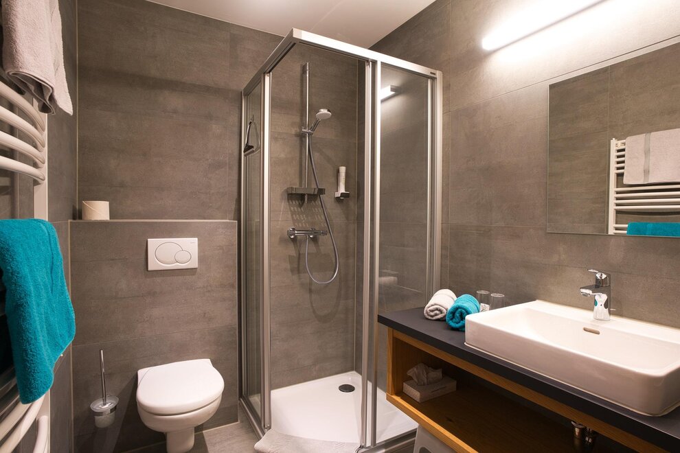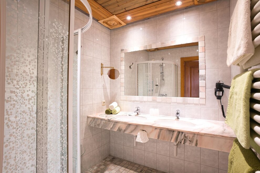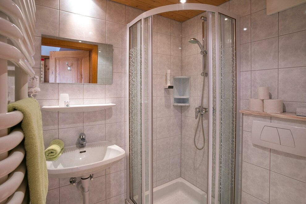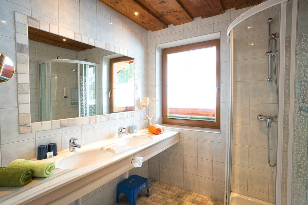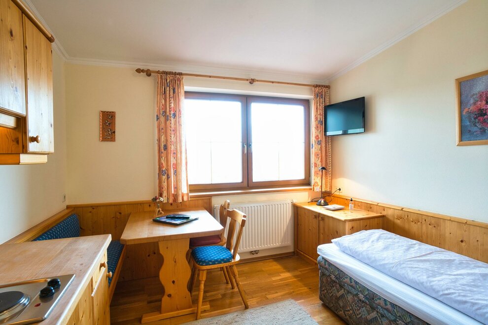 Spacious room with a bench, view of the Dachstein Mountains, shower, toilet, hairdryer, kettle, satellite TV, refrigerator, bed is extendable to a double bed.