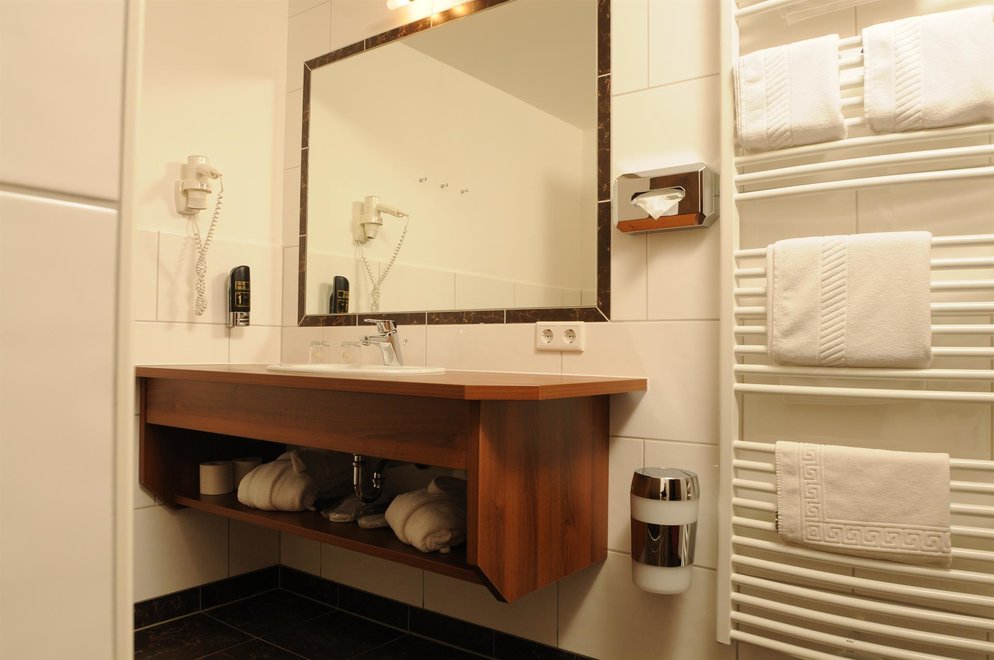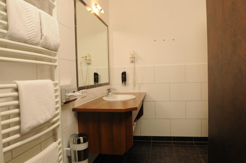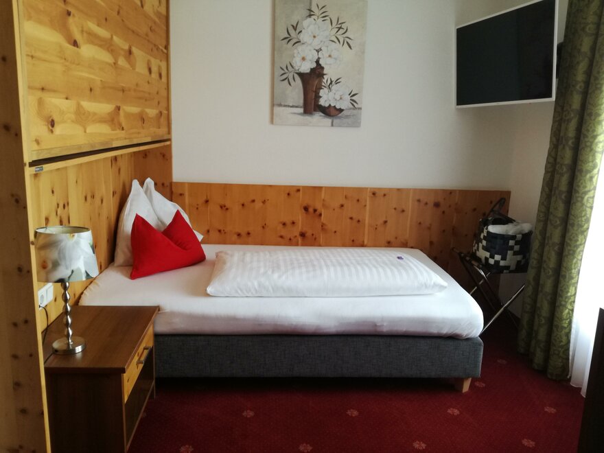 The single room has a large bed, shower, toilet, desk, flat TV, safe and a second sleeping possibility (hinged bunkbed)