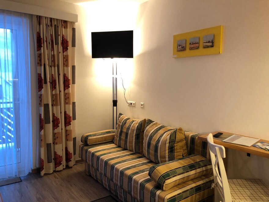 Apartment in the neighbouring house of the Kollerhof with one bedroom and living room with fully equipped kitchen, 1 bathroom with shower/WC, living room with dining area for 6 persons. A small room with a bunk bed is available for children. This apartment has its own entrance, a small garden and a balcony. Sauna, ski cellar and ski boot warmer in the Kollerhof. Towels and bed linen are included in the flat; bread roll service, ski bus stops directly in front of the house
