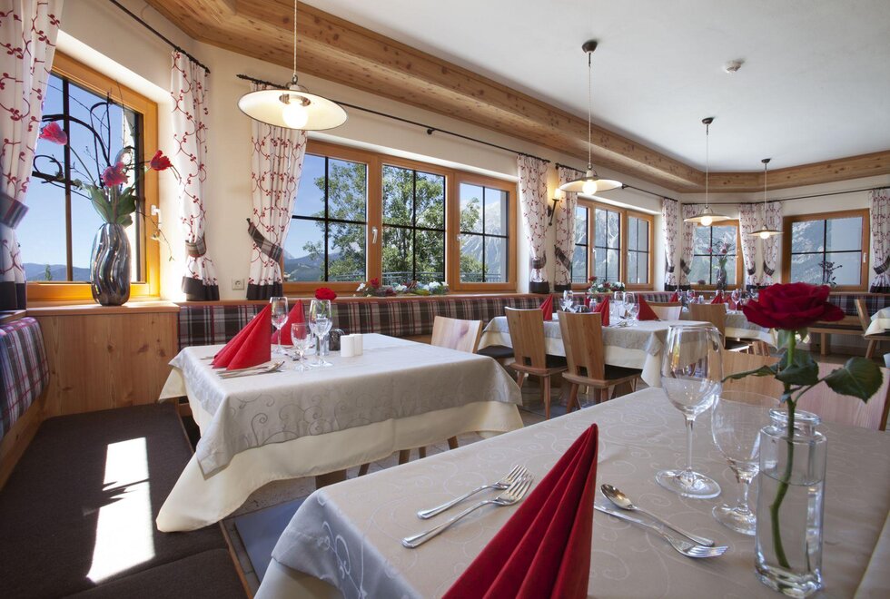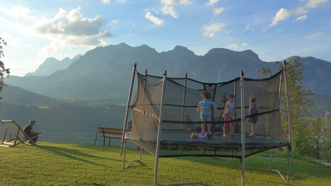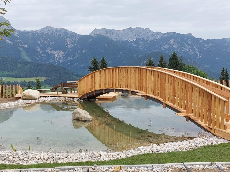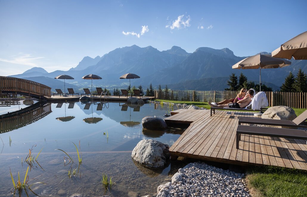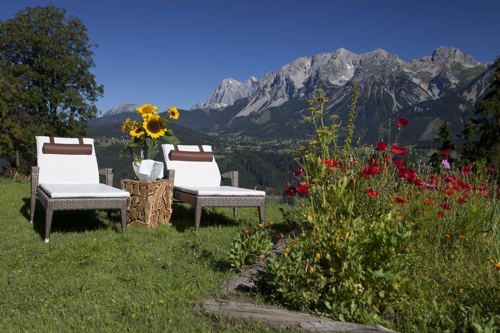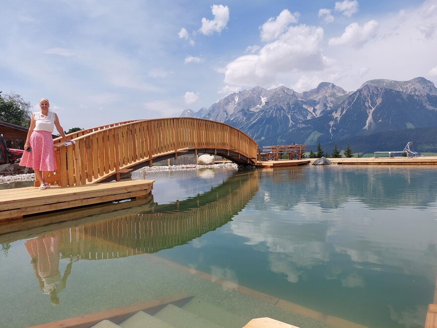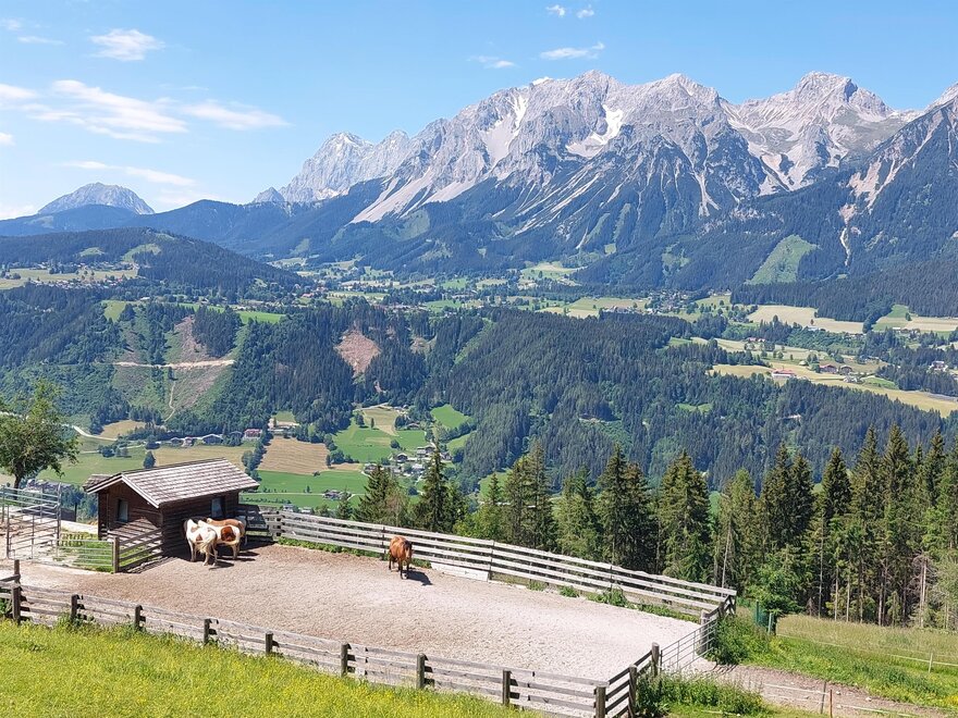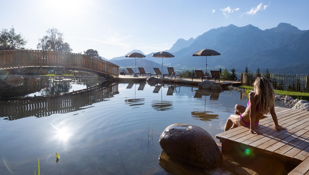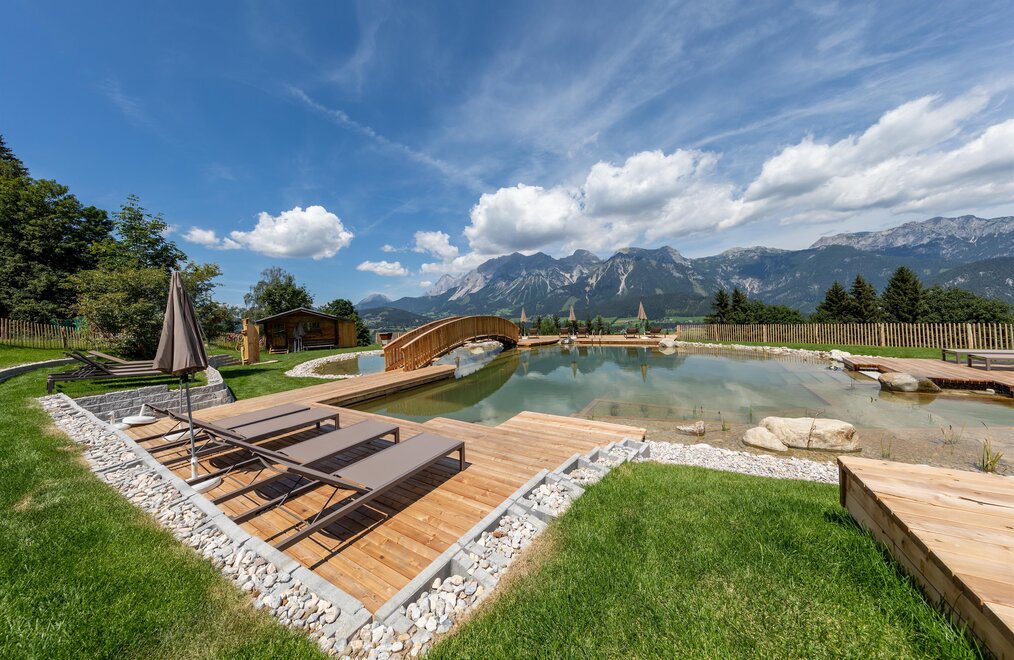 Pampering package: big breakfast buffet, salad buffet, choice of dinner menus, theme nights. Feel-good area with sauna oasis, hotel's own natural swimming pond, big kids’ playing field. Animals such as cats, rabbits, hens, sheep, donkeys, horses... all call our farm home. Family hikes, riding on our horses/ponies, and the many offers included with the Schladming-Dachstein Sommercard make your vacation unforgettable!