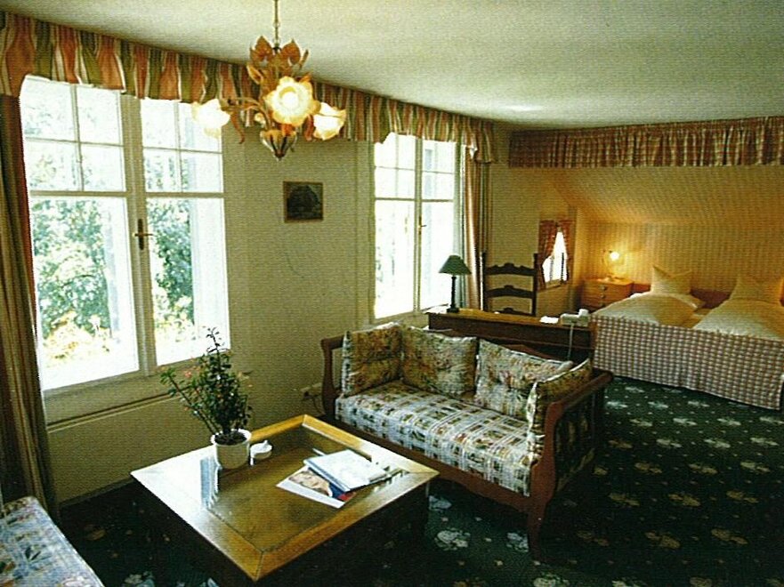 The spacious family suite accommodates up to 4 people (2 extra beds possible). The suite features a living area that is spatially separated from the sleeping area with a pull-out couch. The elegant bathroom is equipped with a bath, double sink, and toilet. You will enjoy views of the hotel's ornamental pond, the south-facing sunbathing lawn, and our feeding trough.
