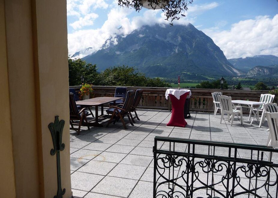 The romantic wedding room. Spacious double room with two balconies, one overlooking the garden and the other towards Ennstal and Grimming. The room offers a shower and bathtub, a double sink, and a toilet.