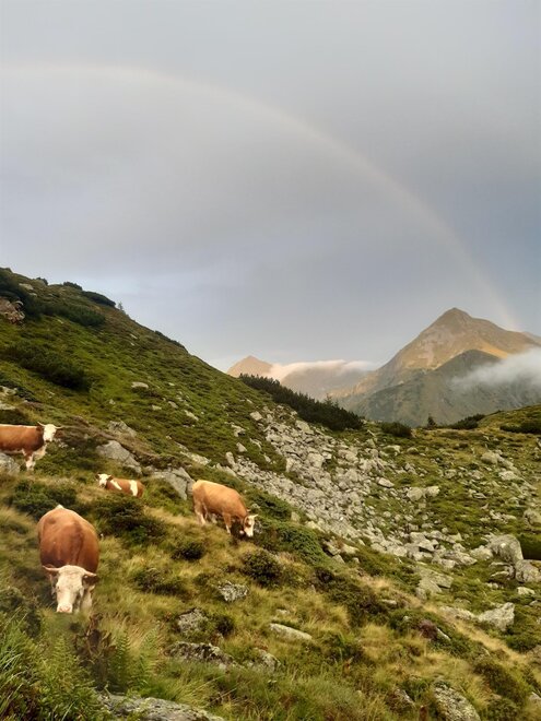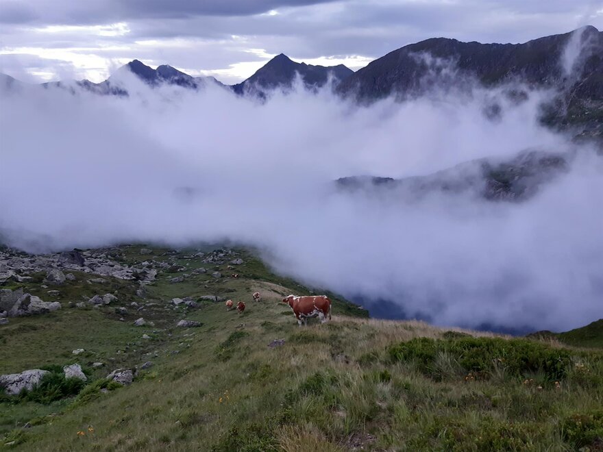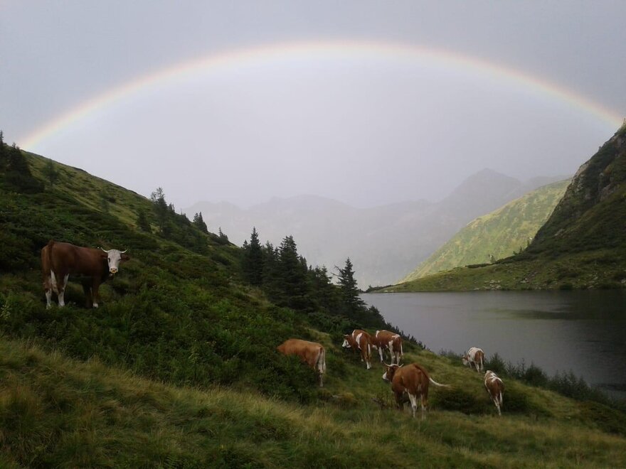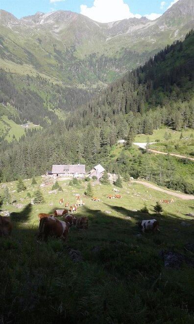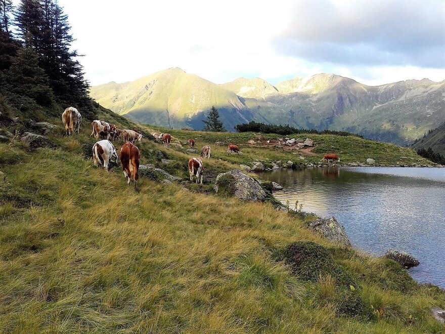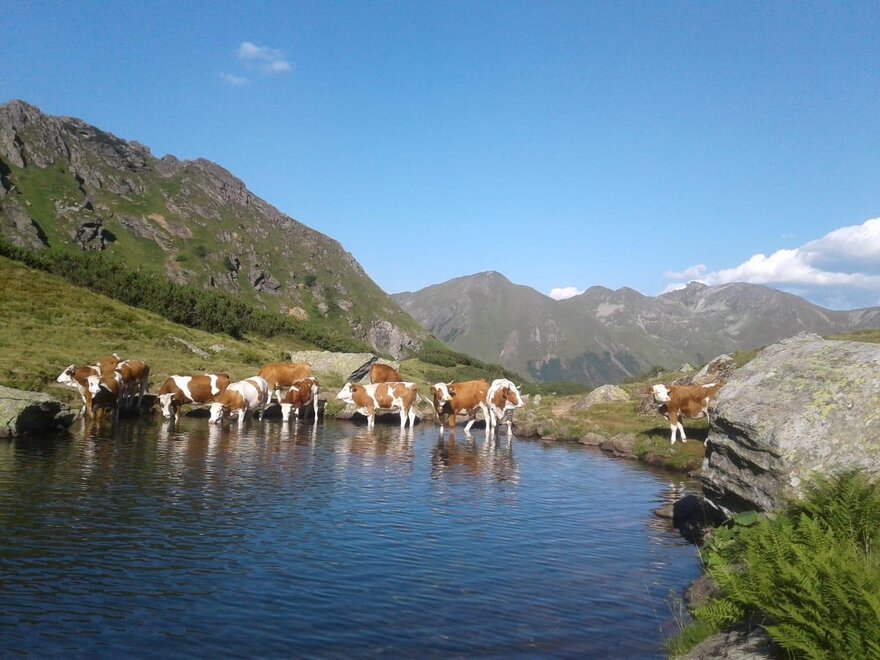 There are grazing about 40 cattles (therefrom up to 8 milking cows) during summer from mid-june to mid-september. The area for the cattle reach up to the Sölkpass and up to the second lake (2. Kaltenbachsee).