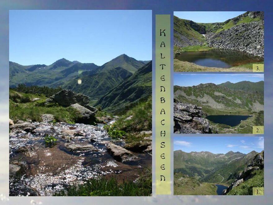 Sölkpass (1790m), Römerweg (Eiszeitlehrpfad), Hornfeldspitze (2277m), Nageleck (2155m), Three Lakes: 3 Kaltenbachseen, Etrachboden, Schafspitze, Deneck (2433m)