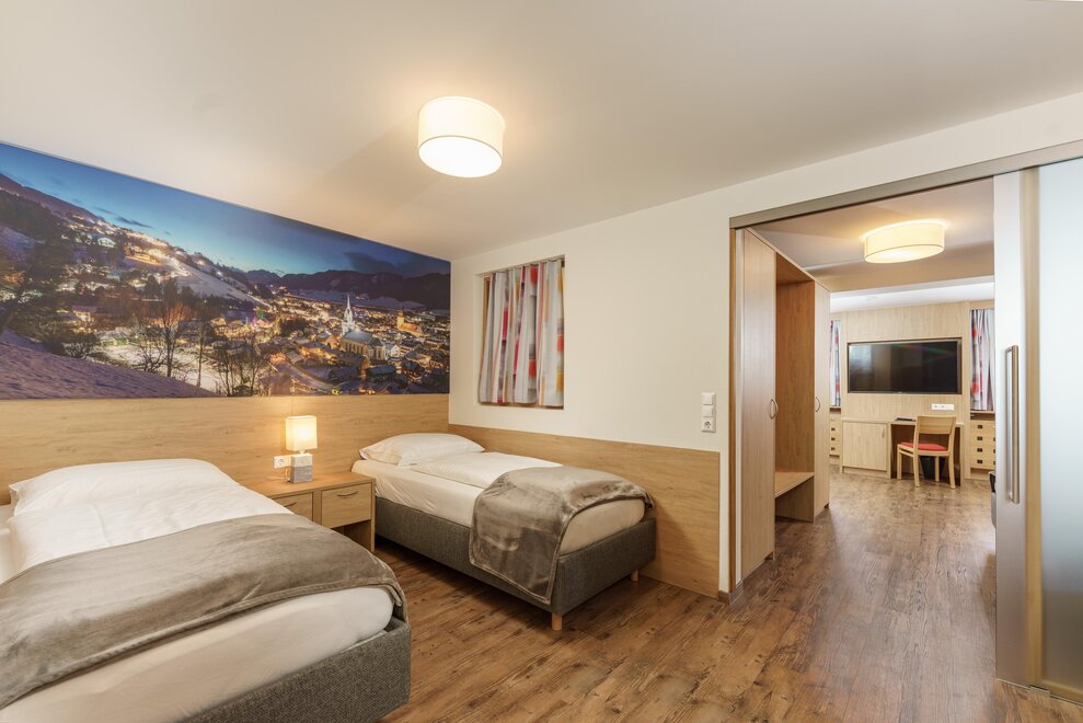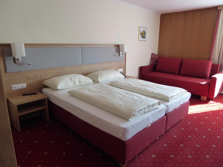You can book our spacious family rooms for groups of 4 or more. This gives you enough space for retreat and privacy on a holiday with a larger family or smaller group. All rooms are equipped with bathtub or shower and WC and have a flat-screen TV with cable connection and free WLAN.