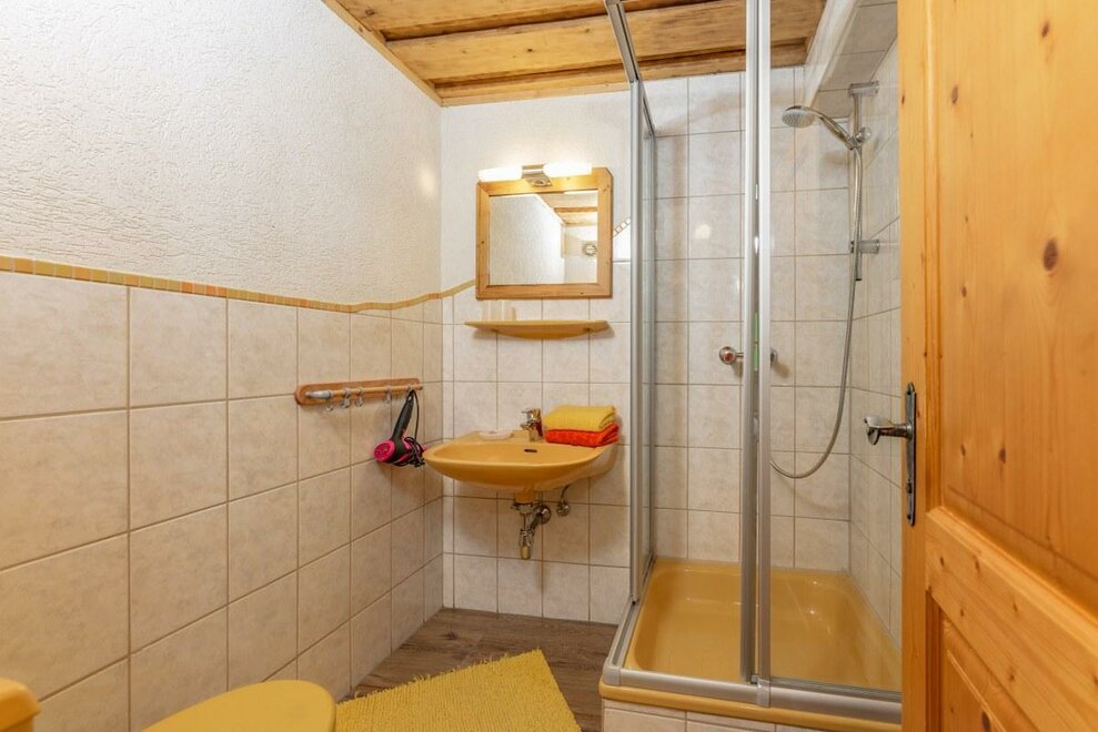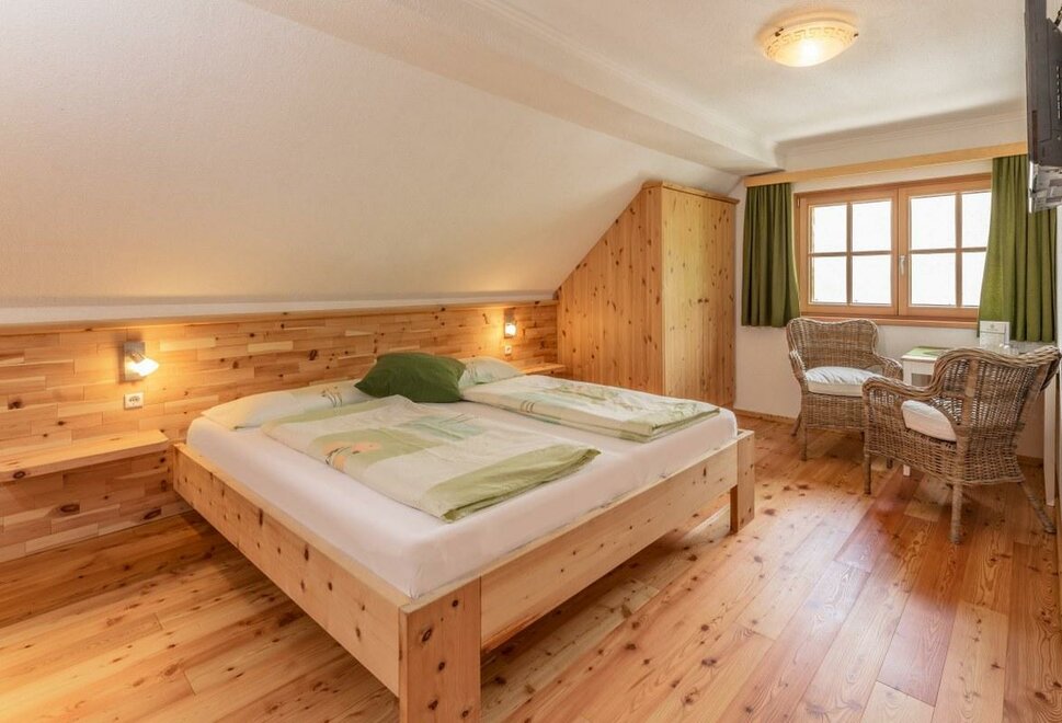 Our cozy room "Dachsteinblick" is equipped with a double bed, single bed and a private bathroom with shower, toilet and hairdryer.
