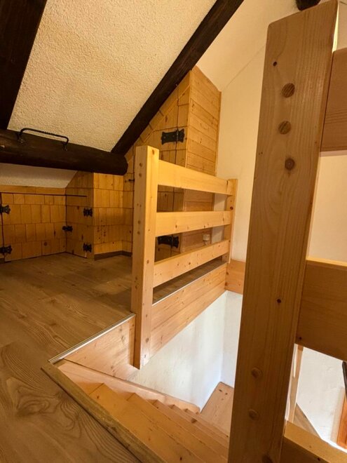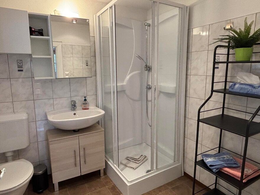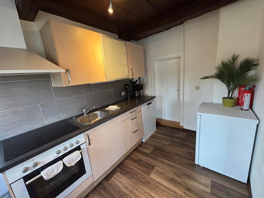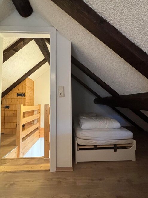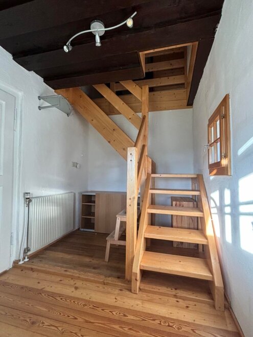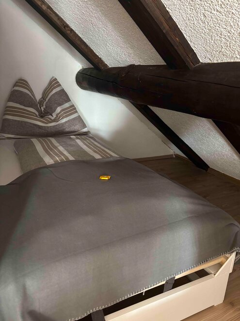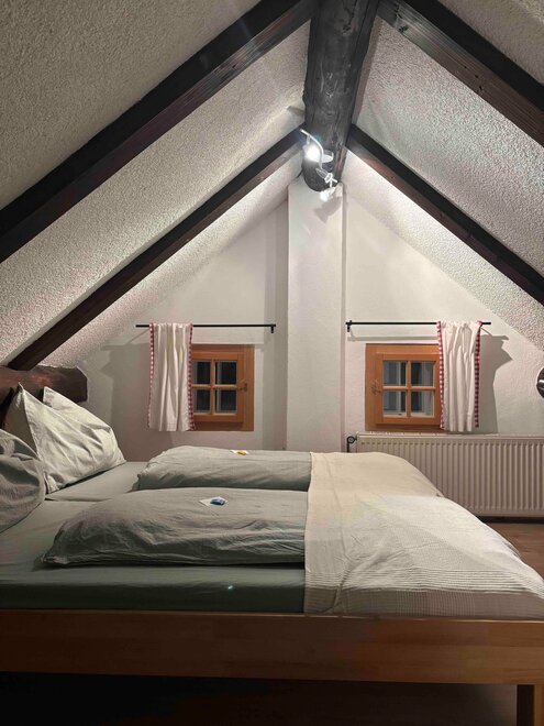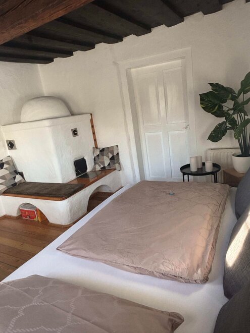 The fully equipped kitchen invites you to cook together and offers everything you need, including an electric stove, a dishwasher, a coffee machine, a kettle, a toaster, and various dishes. The cozy living area with a traditional tiled stove ensures a comfortable atmosphere, including a dining area. The bathroom and toilet are in impeccable condition and provide you with the comfort you desire. Furthermore, ample storage space is available to conveniently accommodate your personal belongings. On the upper floor, you will find the cozy bedroom, furnished with a double bed and a single bed, ideal for families. There is also a single bed in a small room. Additionally, there is a pull-out couch in the living room where 1-2 people could sleep.