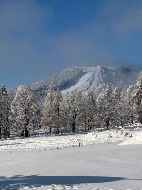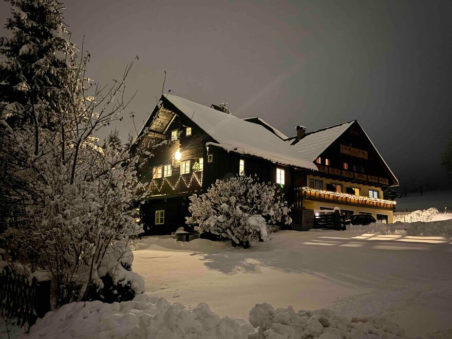 The Knollhäusl is located in a sunny, central location with its own garden and terrace, just a 5-minute walk from the center. There are also stops for ski and hiking buses nearby. A major plus is the cross-country ski trail (Sonnenloipe), which you can access directly behind the house. A ski lift is also located right next to the house, ideal for children and beginners. A pleasant dining opportunity is offered by the restaurant at Knollhof Ramsau, which is located right next door.