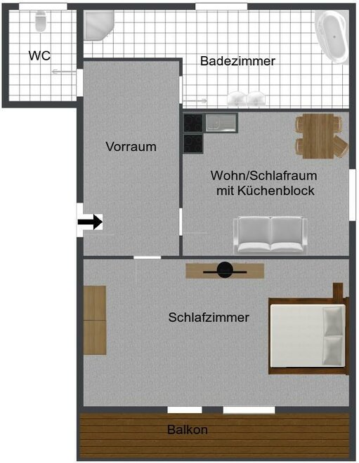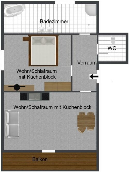 Apartment with 1 bedroom, kitchenette, bathroom with shower/toilett, SAT-TV, balcony, free WiFi