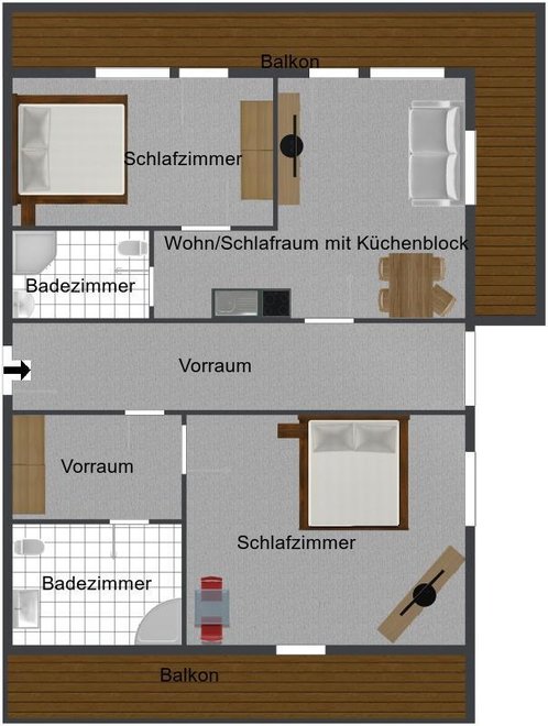 Apartment with 2 bedrooms, kitchenette, 2 bathrooms, SAT-TV, balcony, frei WiFi