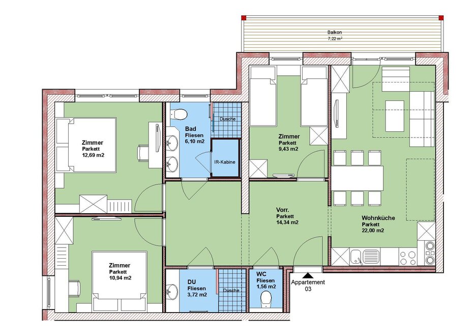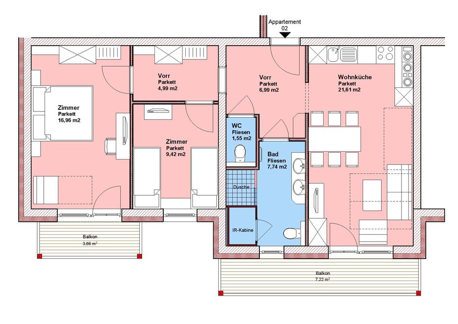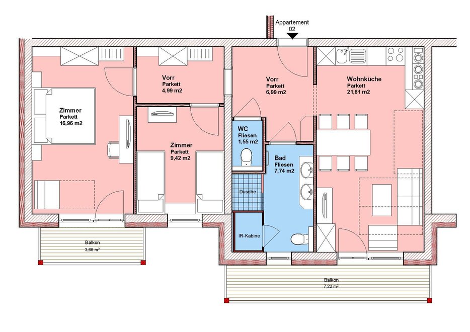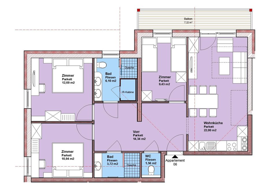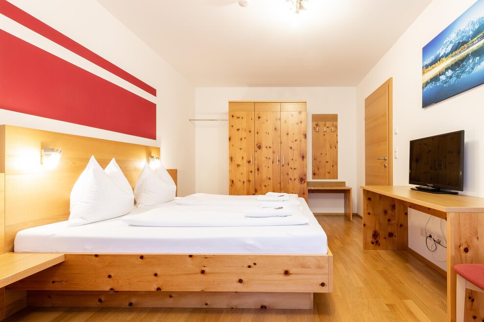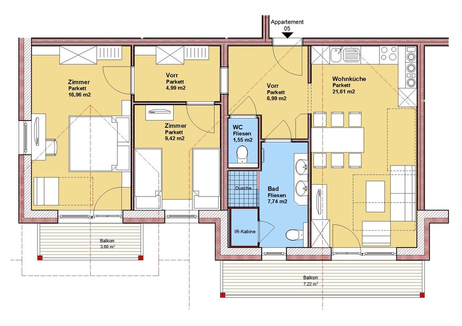 Apartment Dachstein, with a size of 88m², accommodates 6-9 persons and offers you every comfort imaginable. Equipment: »App. For 6-9 persons with approx. 88m² incl. Balcony »App. Are furnished with pinewood and oak parquet »2 double bedrooms» 1 bedroom with 2 single beds (which can also be pushed together) »living-room with SAT TV and pull-out couch» 1 pull out comforter »kitchen with dining area» 1 bathroom with shower, WC And infrared cabin »1 bathroom with shower» 1 WC extra »balcony» free W-LAN