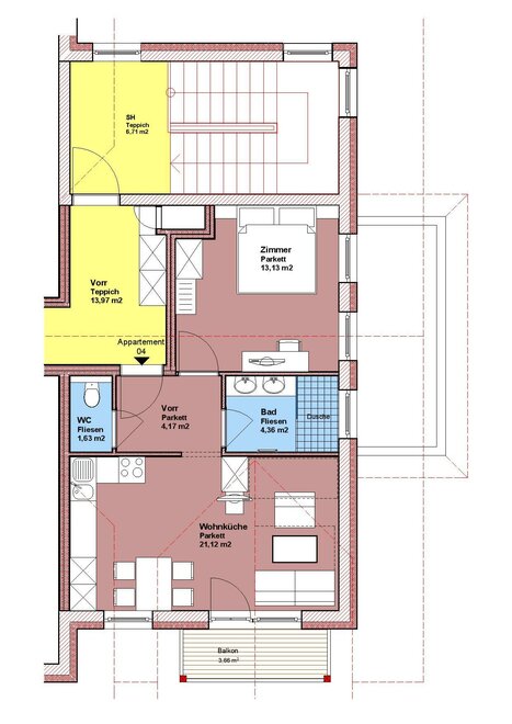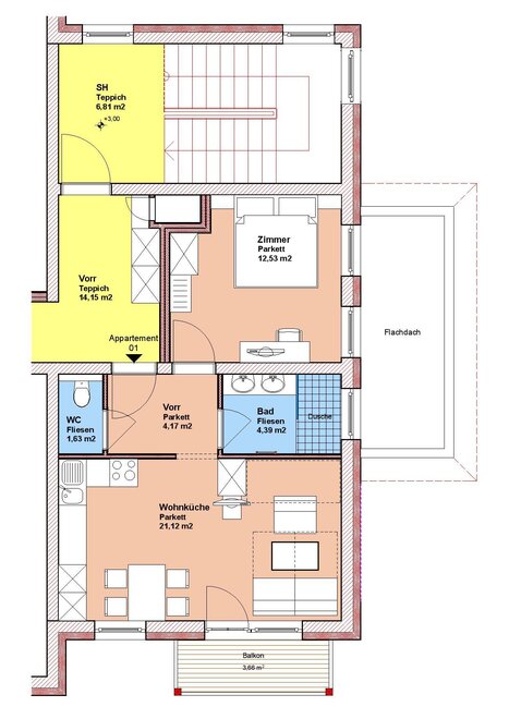 Equipment: »App. For 2-5 persons with approx. 48m² incl. Balcony »App. Are furnished with Swiss pine furniture and oak parquet »Living-kitchen with fully equipped kitchen and dining-area» Living-room with SAT TV and pull-out couch »1 double-bedroom» 1 pull-out comforter »Bathroom with shower» WC extra »Balcony» Free W-LAN