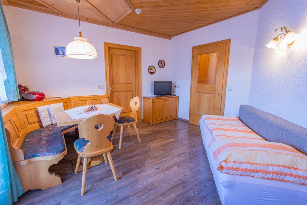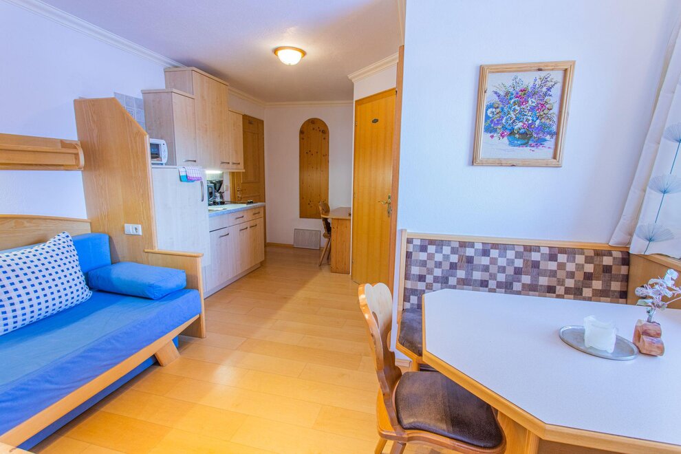 The studio Rötelstein is furnished in warm colors. A cozy seating area with satellite TV, a sofa bed, and a small kitchenette make the living area really comfortable. Shower and toilet are separated in a bathroom. The bright bedroom allows you to dream of the next mountain tour in the Schaldminger Tauern. The Rötelstein, on the other hand, is the local mountain of the Filzmoos hiking region and is the most famous mountain in the pilgrimage site, alongside the Bischofsmütze. From the balcony, you can also see the Dachstein backdrop. All our guests can, of course, use the wellness area. We also provide our guests with breakfast and/or half-board upon request.