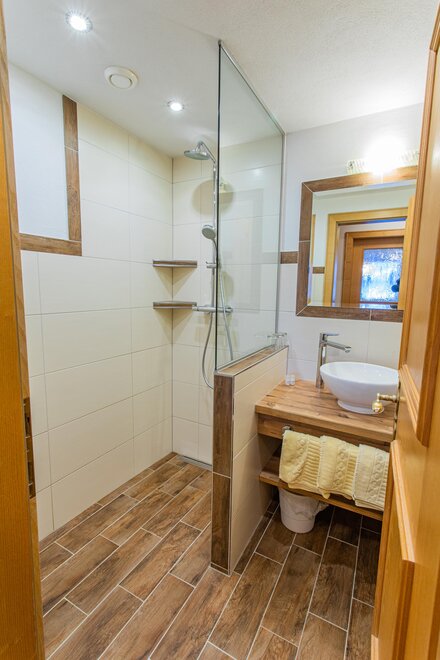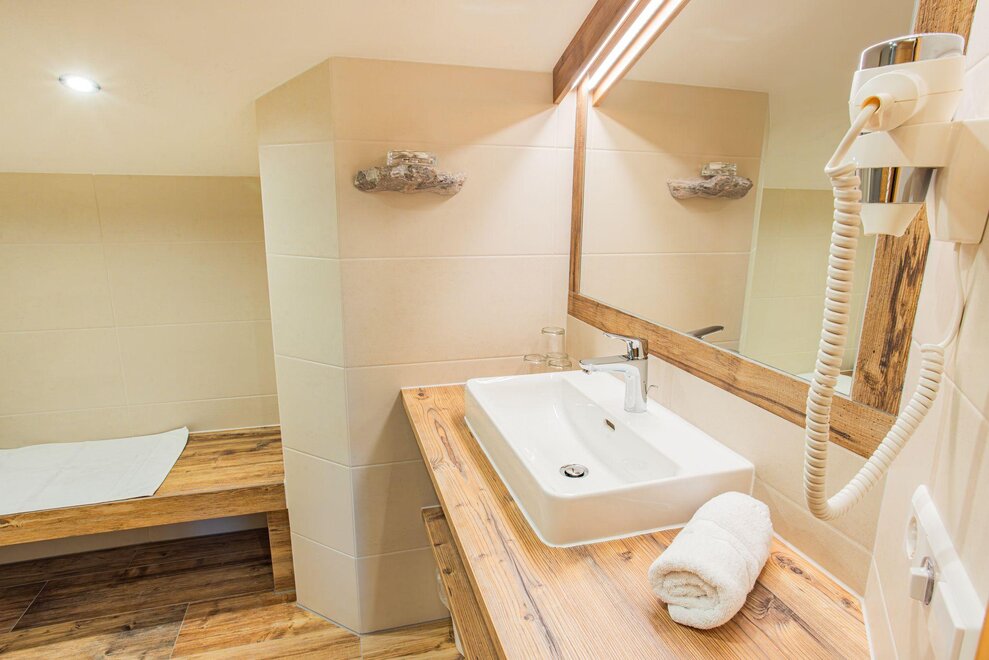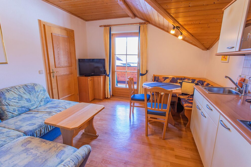 With a view of the Schladminger Tauern, this apartment offers excellent relaxation. A spacious living area with a sofa bed, cozy seating corner, and large kitchenette invite cozy game nights with the children. A large double bed with a wardrobe ensures plenty of rest after extensive hikes in the Dachstein mountain range. The newly designed bathroom with built-in radio will have you dancing through the shower. All our guests can, of course, use the wellness area. We also offer breakfast and/or half-board upon request. For late risers, we provide a bread roll service.