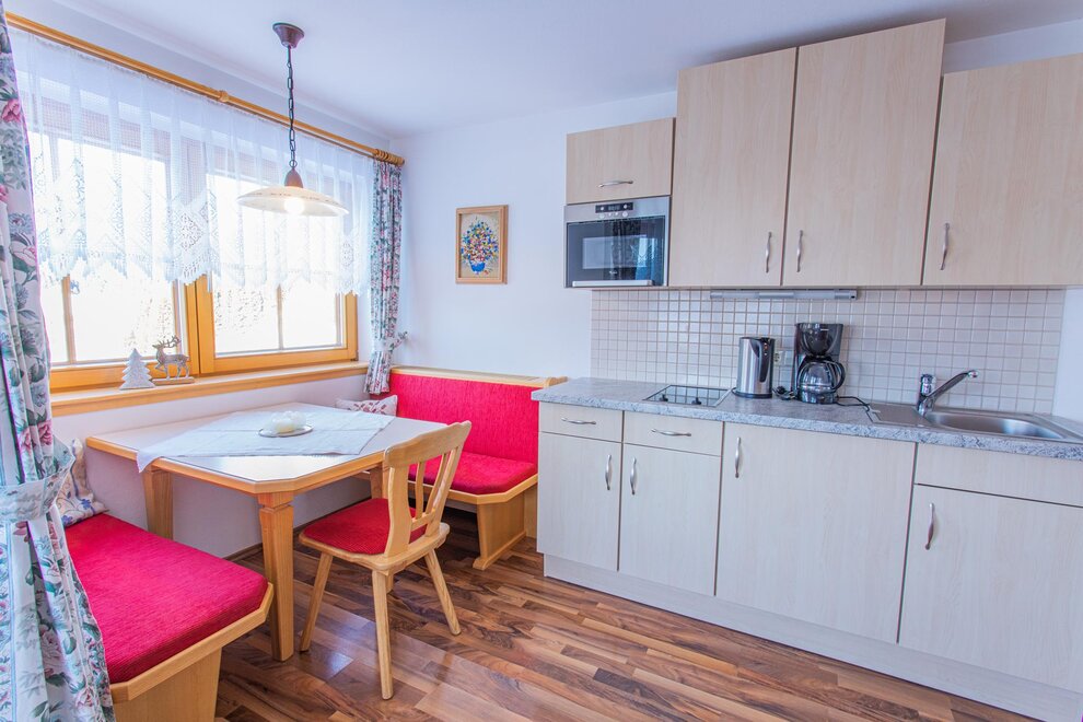 In 2021, the Scheichenspitz studio was expanded and renovated, offering an incredible view of the Scheichspitz, the local mountain of Ramsau am Dachstein. Spacious bedroom, a cozy living kitchen, and a window seat with a mountain view for reading a book.