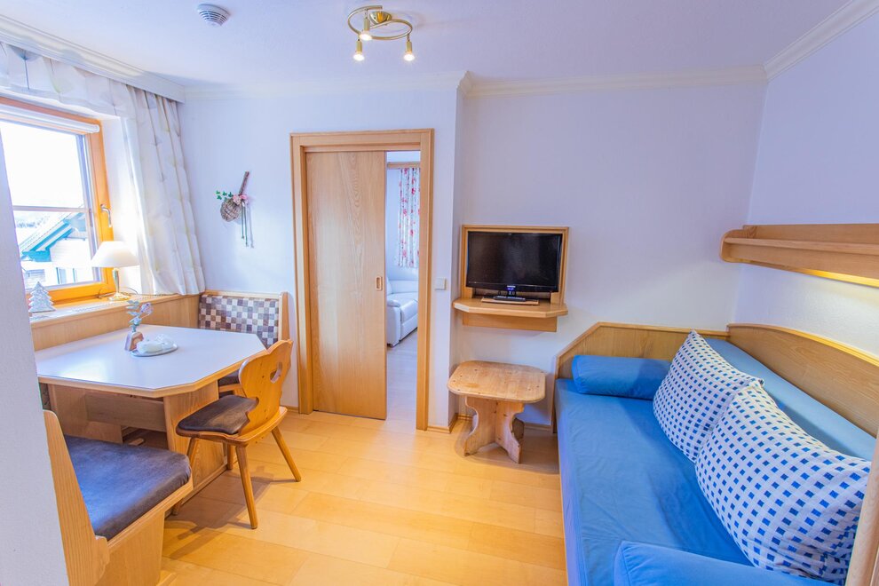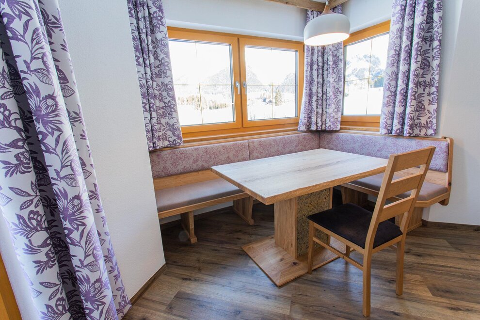 With a view of the Schladming Tauern, this apartment is perfect for relaxing. A spacious living area with a sofa bed, cozy seating area, and large kitchen invites you to enjoy pleasant game nights with the children. A large double bed with a wardrobe provides ample relaxation after extensive hikes in the Dachstein Mountains. The newly designed bathroom with built-in radio lets you dance through the shower with joy. All our guests can, of course, use the wellness area. We also offer our guests breakfast and/or half board upon request. For late risers, we also provide a roll service.