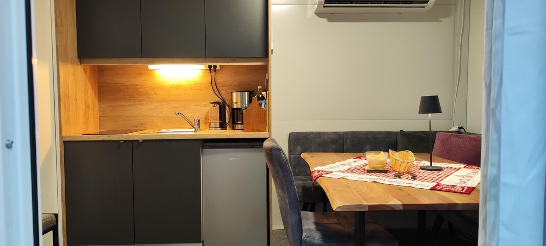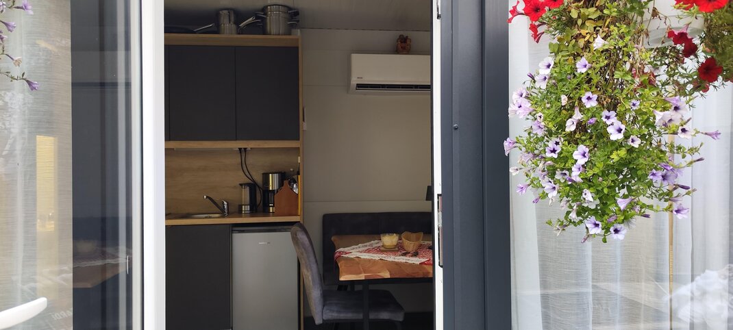 There are 2 bedrooms,one bathroom with toilett and shower and also a living space with a small kitchen.