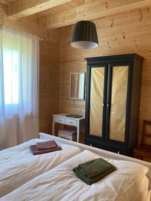 The wooden house on the ground floor consists of a small entrance hall, from which a shower, the bedroom for 2 persons, a toilet, the storage room with a washing machine, and the fully equipped living kitchen branch off. From the living kitchen, which is open to the top with a visible roof structure, a narrow staircase leads to the spacious upper floor with 2-4 beds, a sofa, and a TV with a DVD player.