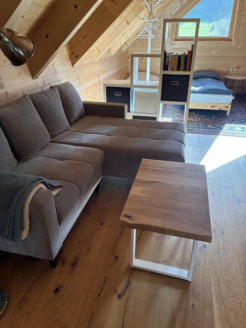 On the ground floor, there is the bedroom, bathroom with shower, WC, storage room for skis and ski boots, and the very well-equipped living kitchen with a comfortable armchair. A narrow staircase leads up to the spacious gallery with exposed roof beams, where you will find a comfortable sofa, as well as beds for up to 4 additional people.