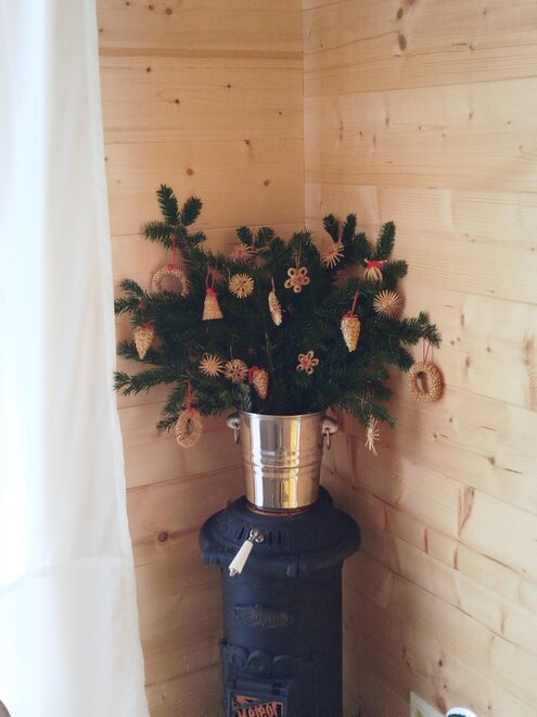On the covered terrace, there is a table with benches, garden chairs are available around the corner, and in summer, there is a gas grill that can certainly be used. Kitchen herbs and strawberries grow beside the house, please help yourselves.