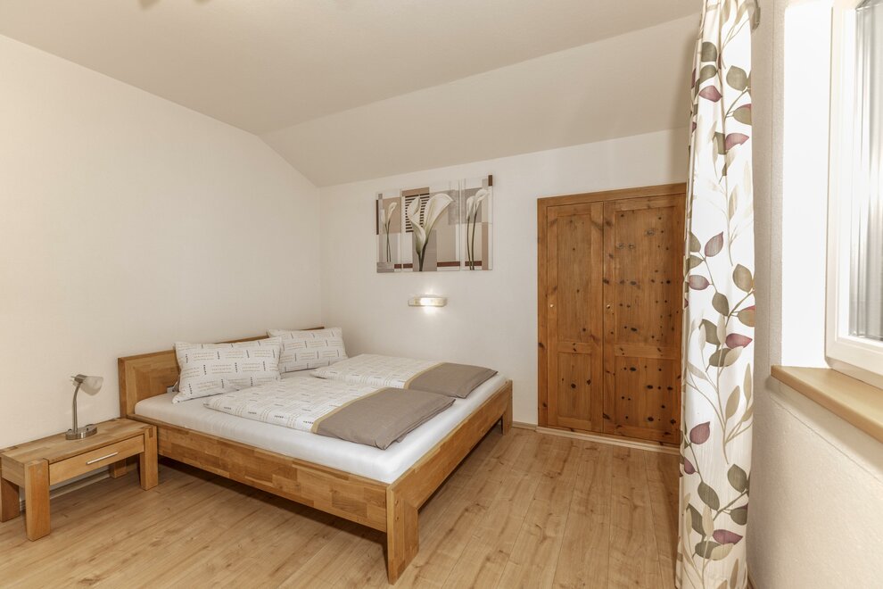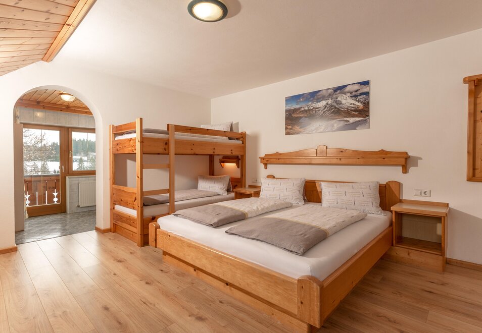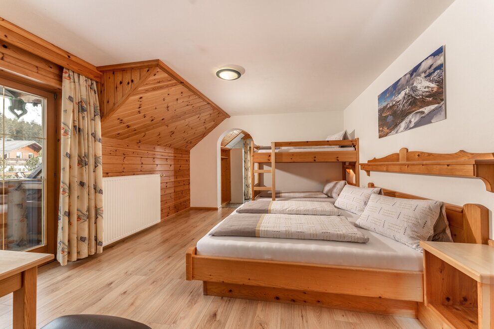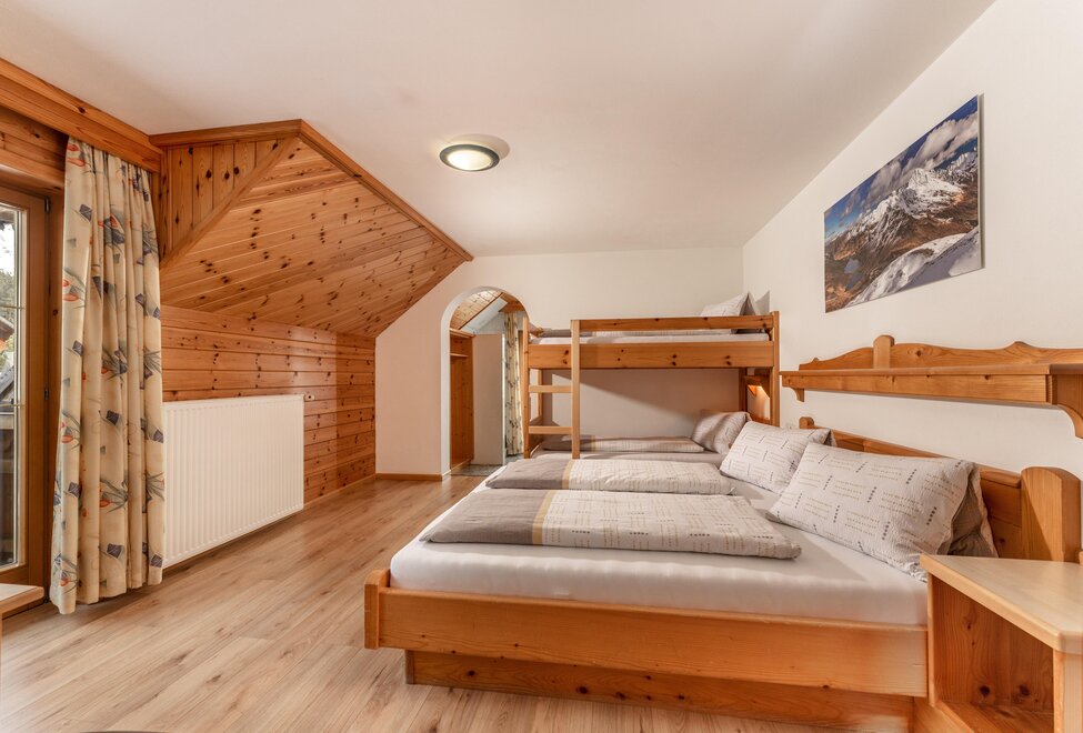 The big, bright room (25m²) is on the 2nd floor of our farmhouse, north-east. 1 double-bed, 1 bunk-bed. Shower, toilette, balcony in both directions. Beautiful view on the landscape of the Schladming-mountains, the Dachstein massif and our playground.